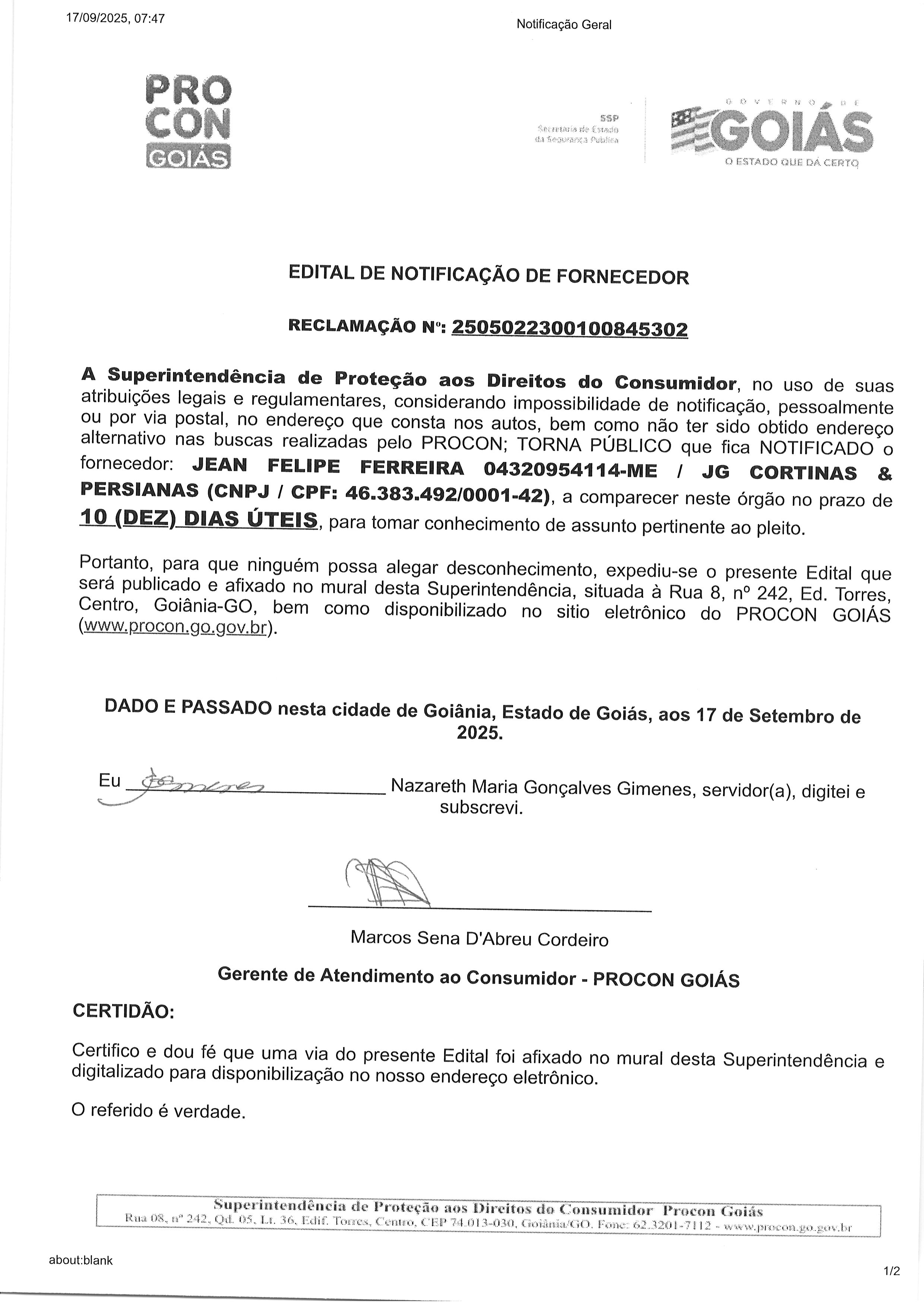 Edital de Notificação N° 2505022300100845302, FORNECEDOR JEAN FELIPE FERREIRA Última Atualização em 6 de outubro de 2025 Categoria Consumidor, Editais de Notificação