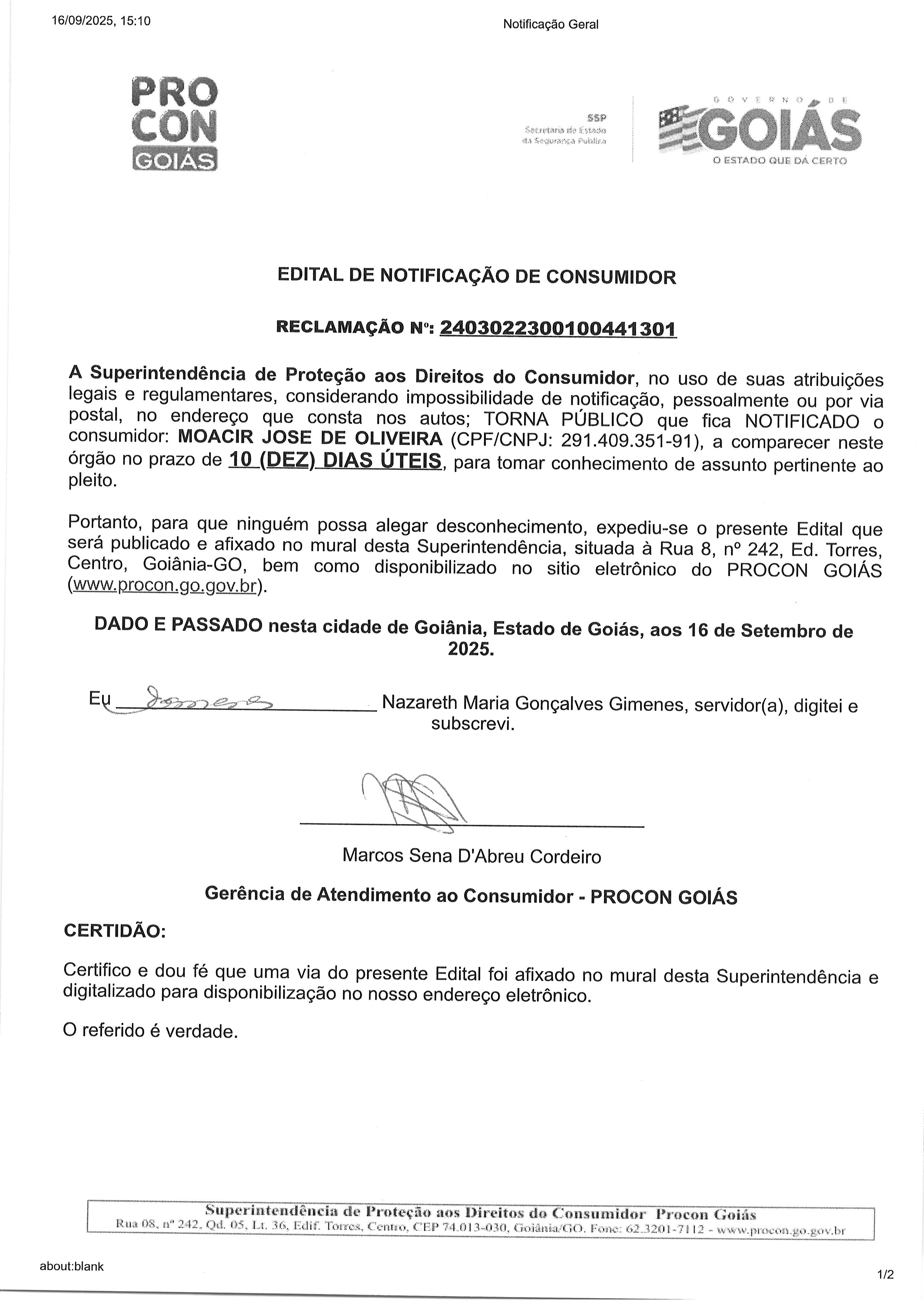 EDITAL DE NOTIFICACAO N°2403022300100441301 CONSUMIDOR MOACIR JOSE DE OLIVEIRA Última Atualização em 6 de outubro de 2025 Categoria Consumidor, Editais de Notificação
