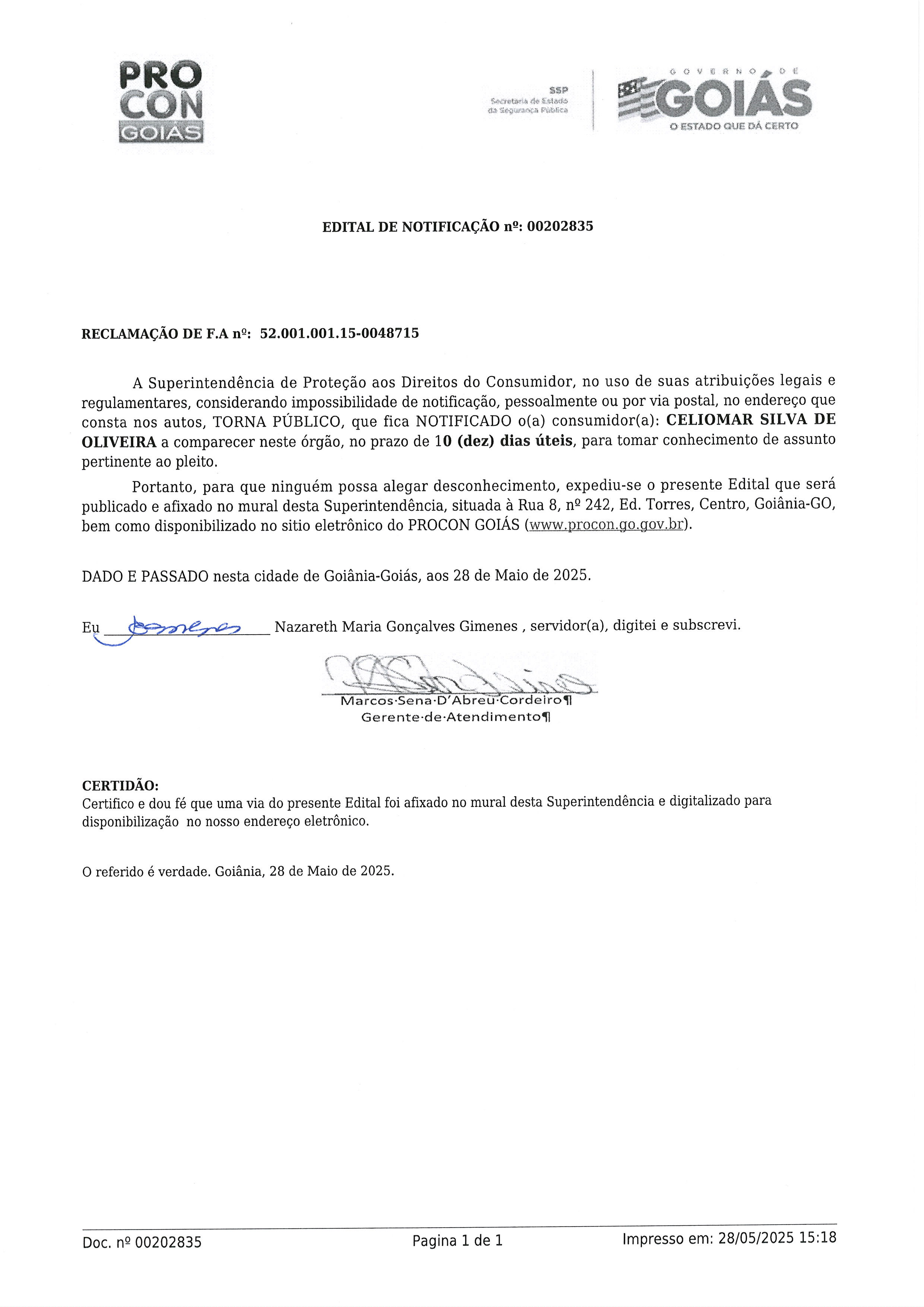 Edital de notificação nº 00202835 , Consumidor CELIOMAR SILVA DE OLIVEIRA Última Atualização em 5 de junho de 2025 Categoria Consumidor, Editais de Notificação Edital de notificação nº 00202835 , Consumidor CELIOMAR SILVA DE OLIVEIRA
