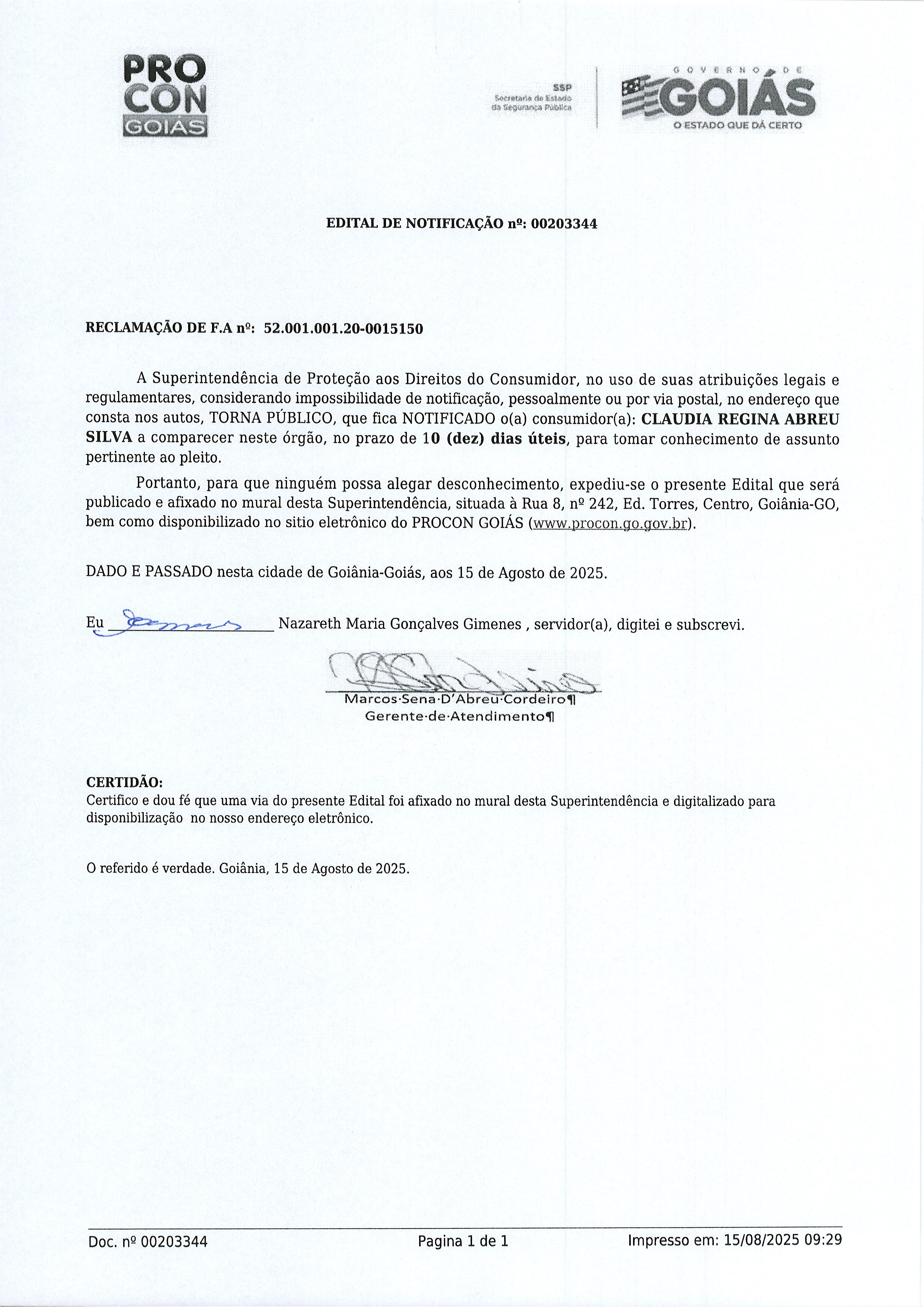 Edital de Notificação Nº 00203344 , Consumidor CLAUDIA REGINA ABREU SILVA Última Atualização em 26 de agosto de 2025 Categoria Consumidor, Editais de Notificação