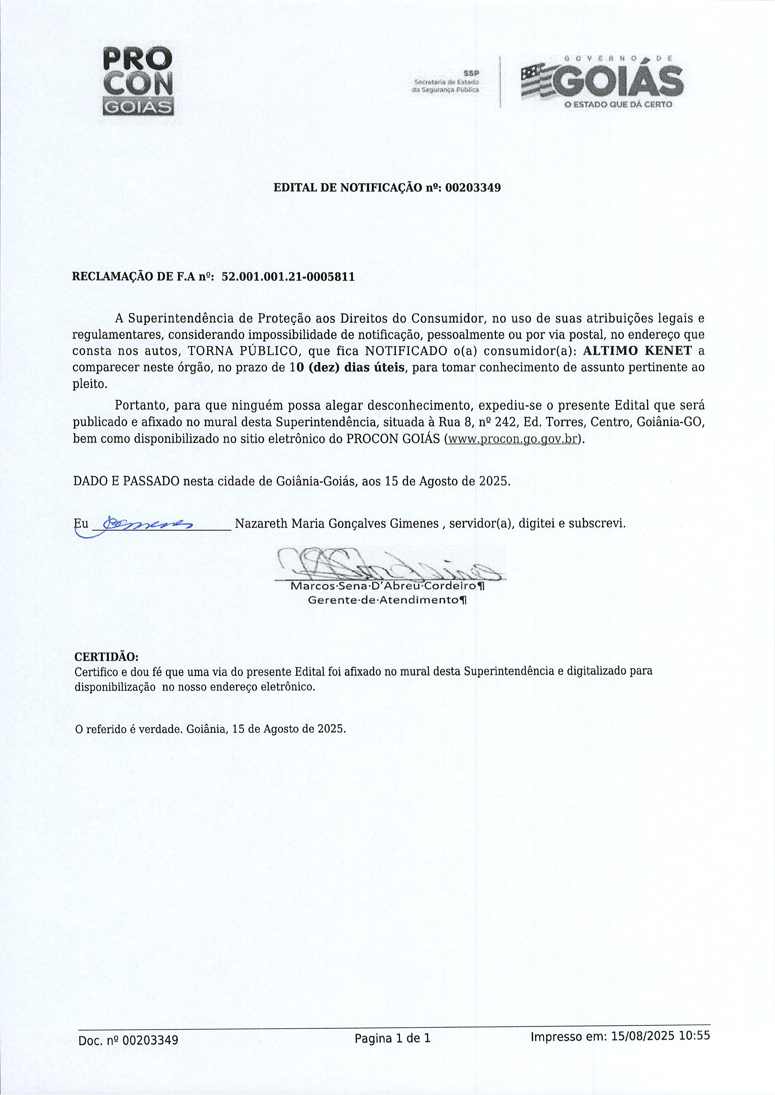 Edital de Notificação Nº 00203349 , Consumidor ALTIMO KENET Última Atualização em 26 de agosto de 2025 Categoria Consumidor, Editais de Notificação