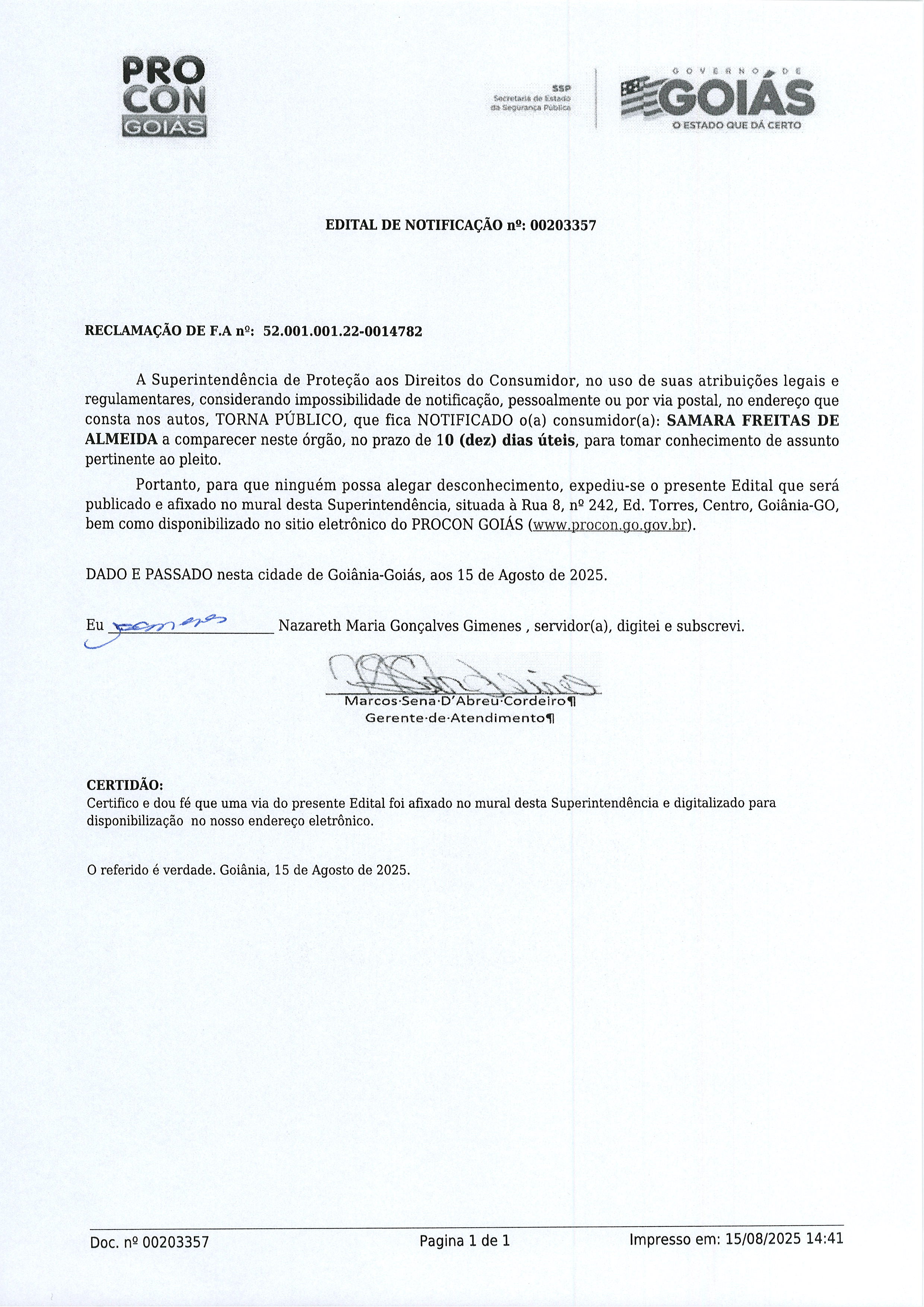 Edital de Notificação Nº 00203357 , Consumidor SAMARA FREITAS DE ALMEIDA Última Atualização em 26 de agosto de 2025 Categoria Consumidor, Editais de Notificação