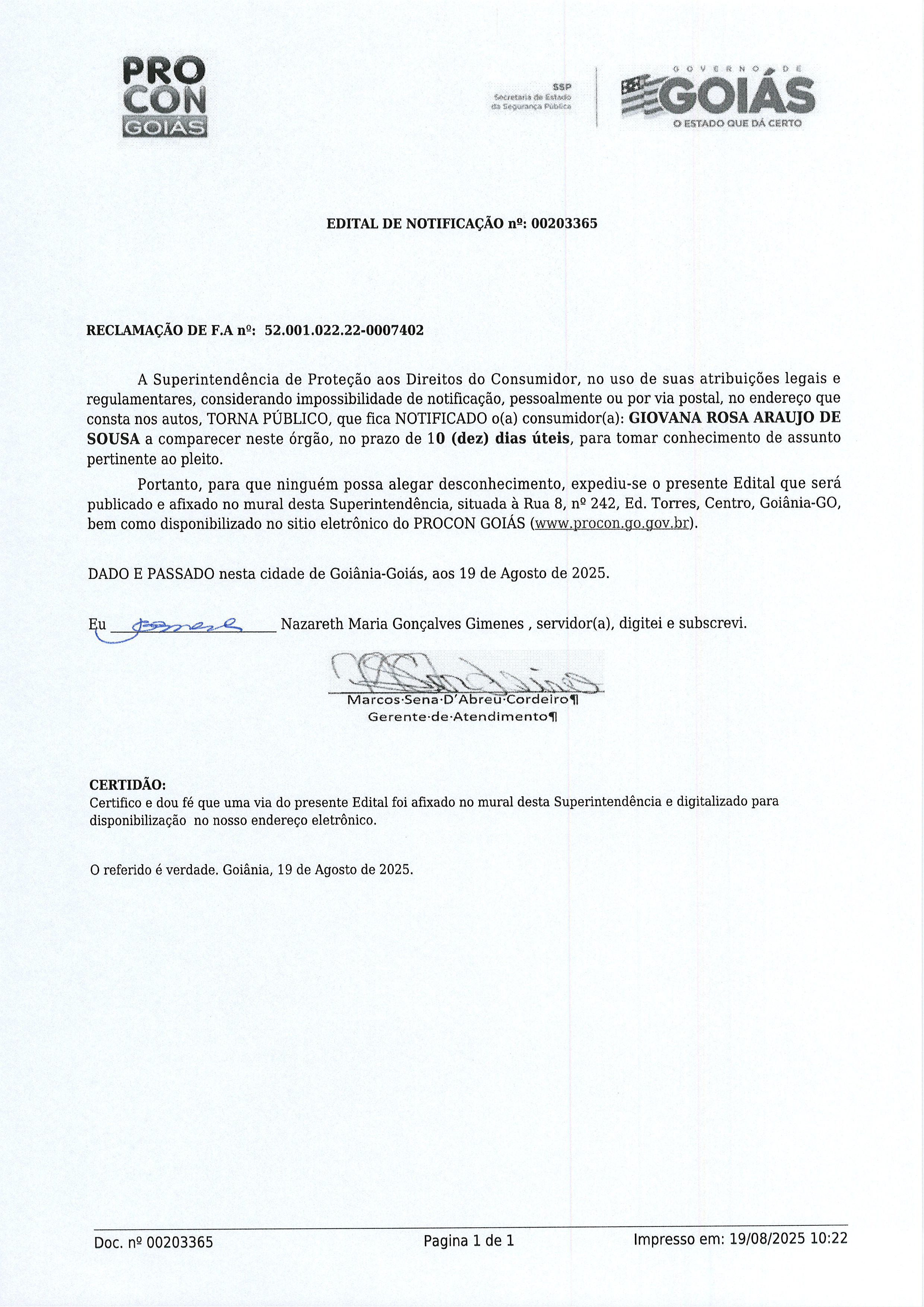Edital de Notificação Nº 00203365 , Consumidor GIOVANA ROSA ARAUJO DE SOUSA Última Atualização em 1 de setembro de 2025 Categoria Consumidor, Editais de Notificação