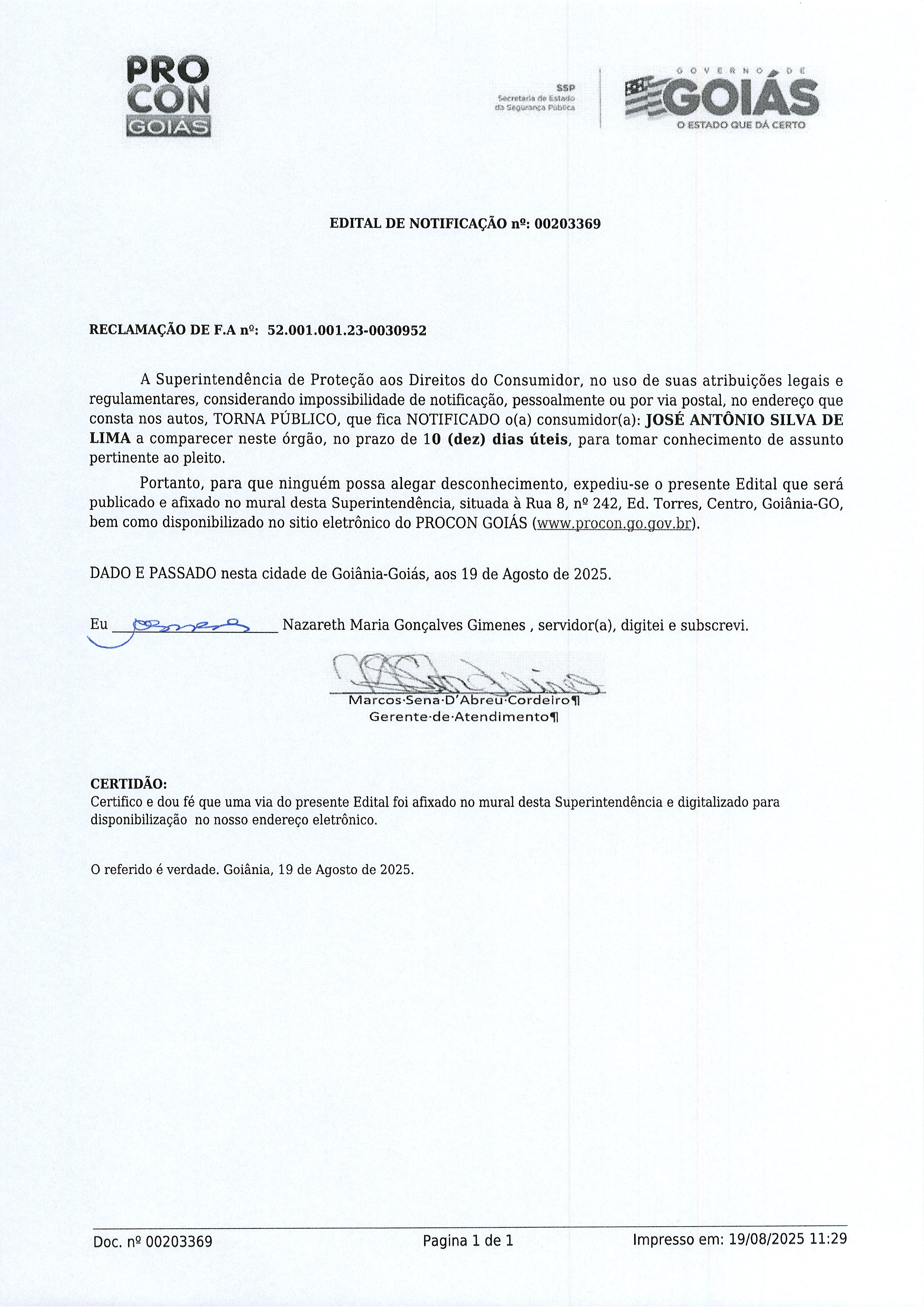 Edital de Notificação Nº 00203369 , Consumidor JOSÉ ANTÔNIO SILVA DE LIMA Última Atualização em 1 de setembro de 2025 Categoria Consumidor, Editais de Notificação