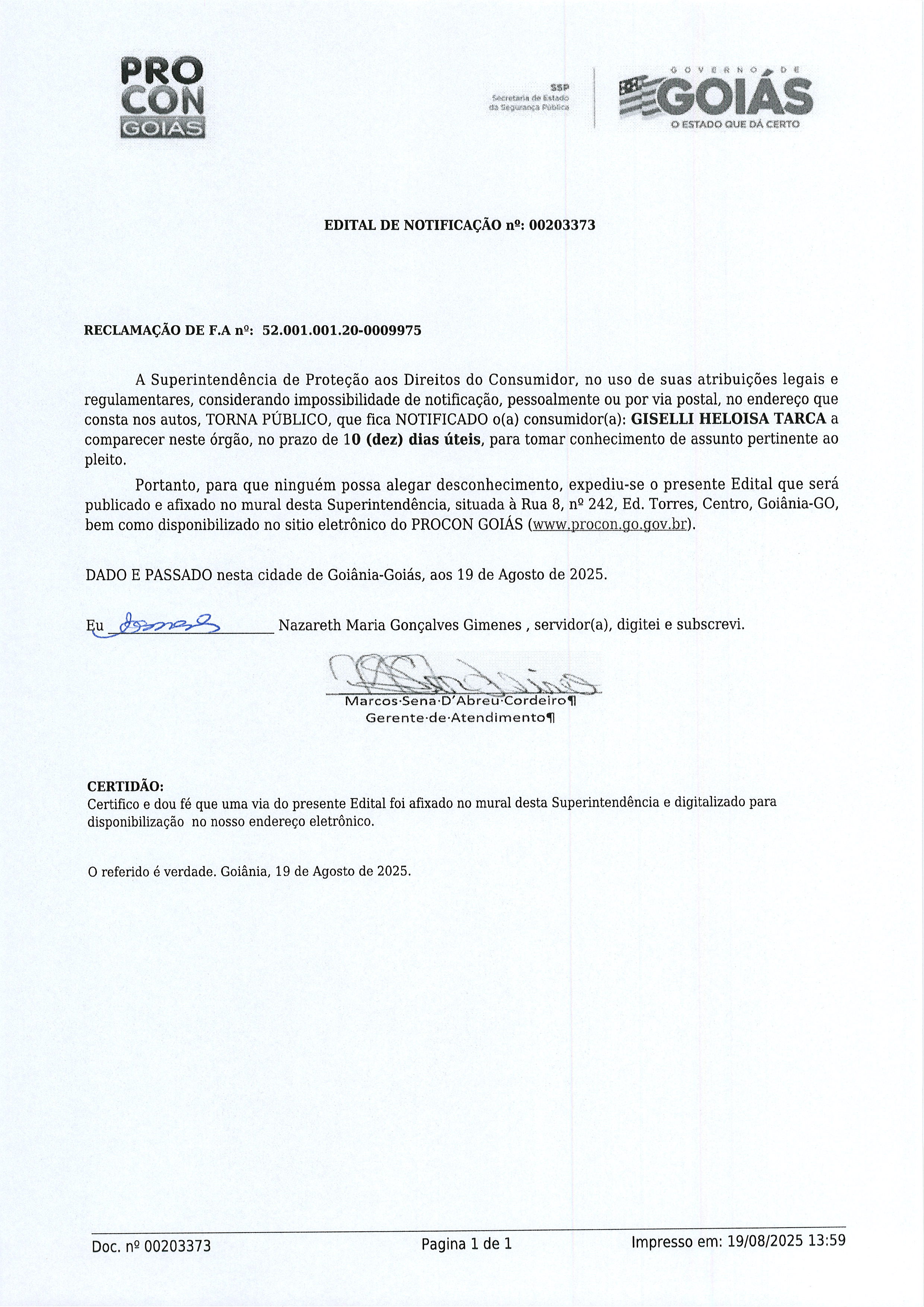 Edital de Notificação Nº 00203373 , Consumidor GISELLI HELOISA TARCA Última Atualização em 1 de setembro de 2025 Categoria Consumidor, Editais de Notificação