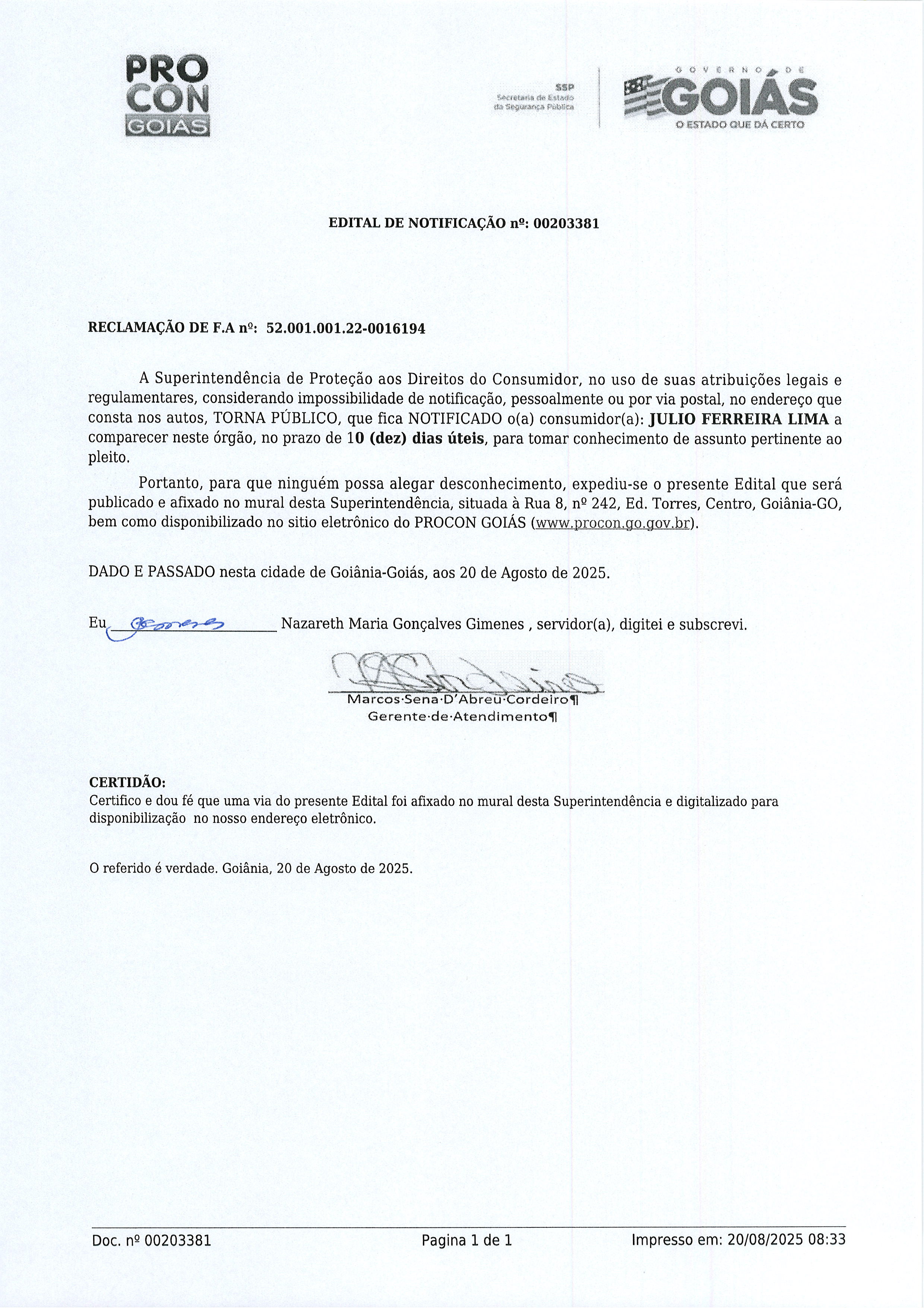 Edital de Notificação Nº 00203381 , Consumidor JULIO FERREIRA LIMA Última Atualização em 1 de setembro de 2025 Categoria Consumidor, Editais de Notificação