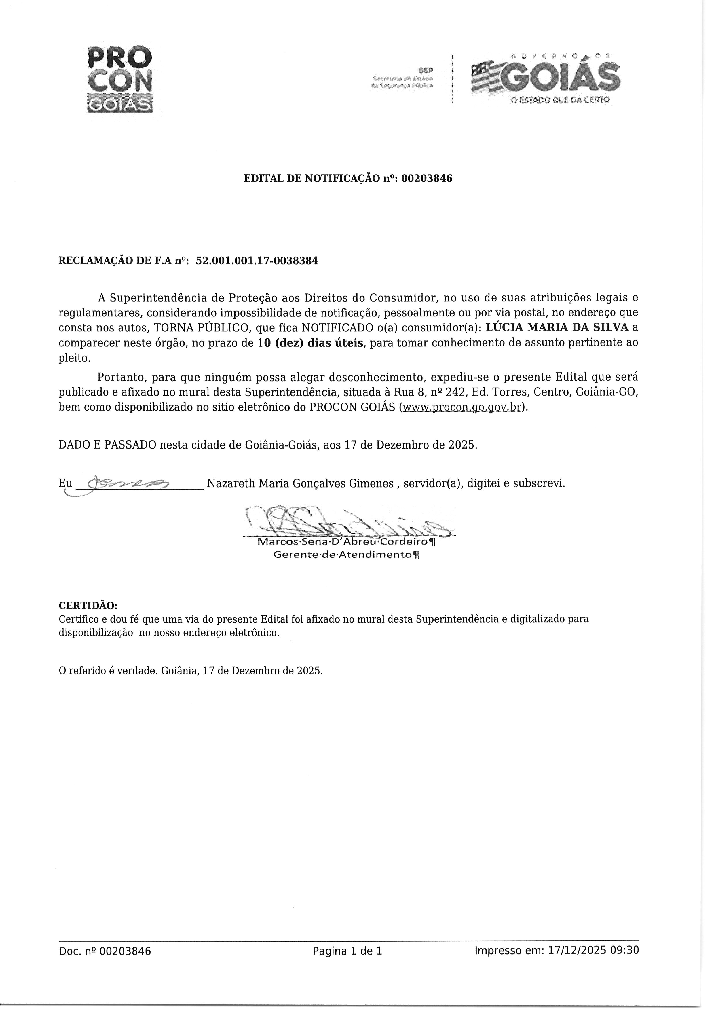 EDITAL DE NOTIFICAÇAO Nº 00203846, CONSUMIDOR LÚCIA MARIA DA SILVA Última Atualização em 21 de janeiro de 2026 Categoria Consumidor, Editais de Notificação