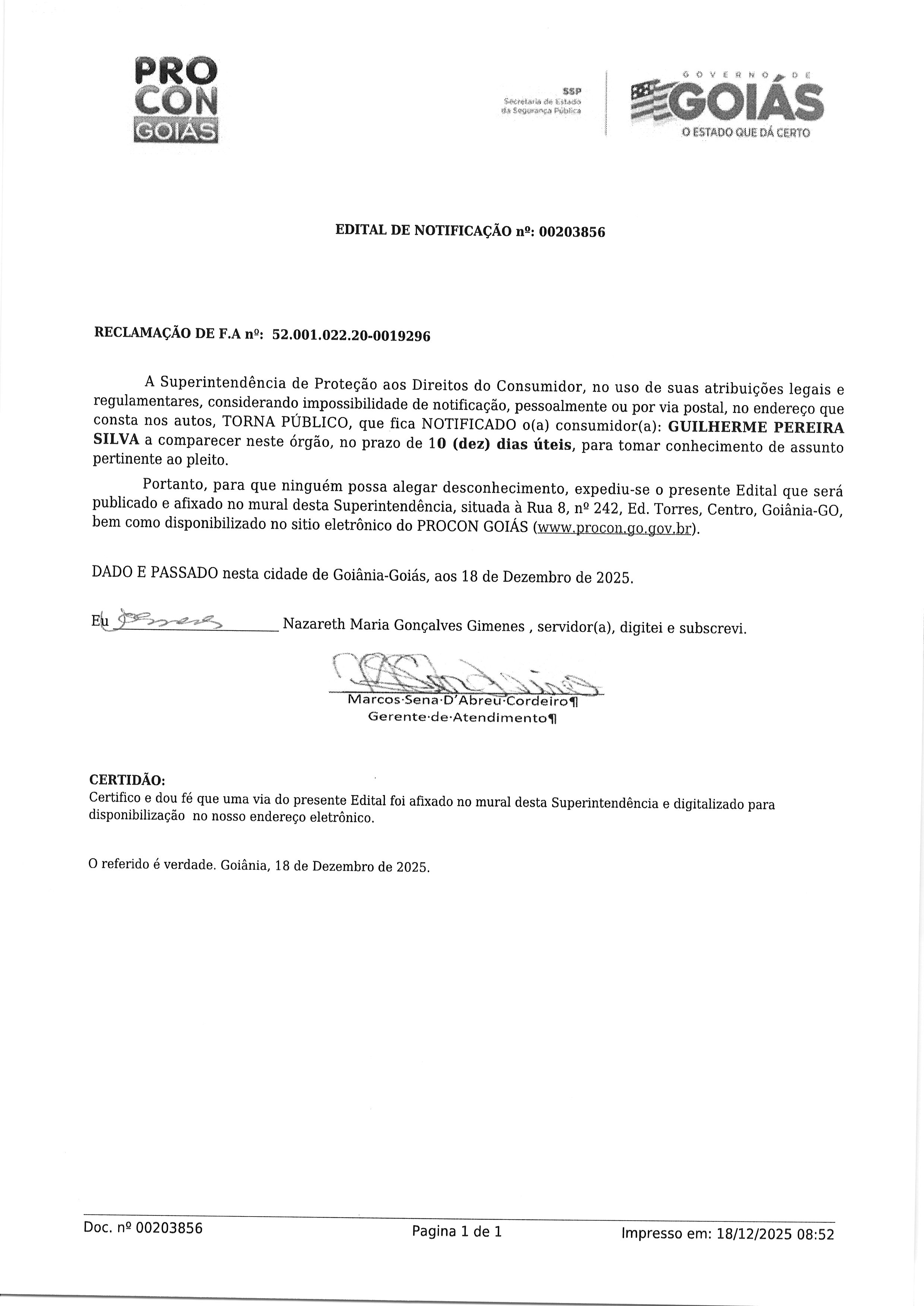 EDITAL DE NOTIFICAÇÃO Nº 00203856, CONSUMIDOR GUILHERME PEREIRA SILVA Última Atualização em 21 de janeiro de 2026 Categoria Consumidor, Editais de Notificação