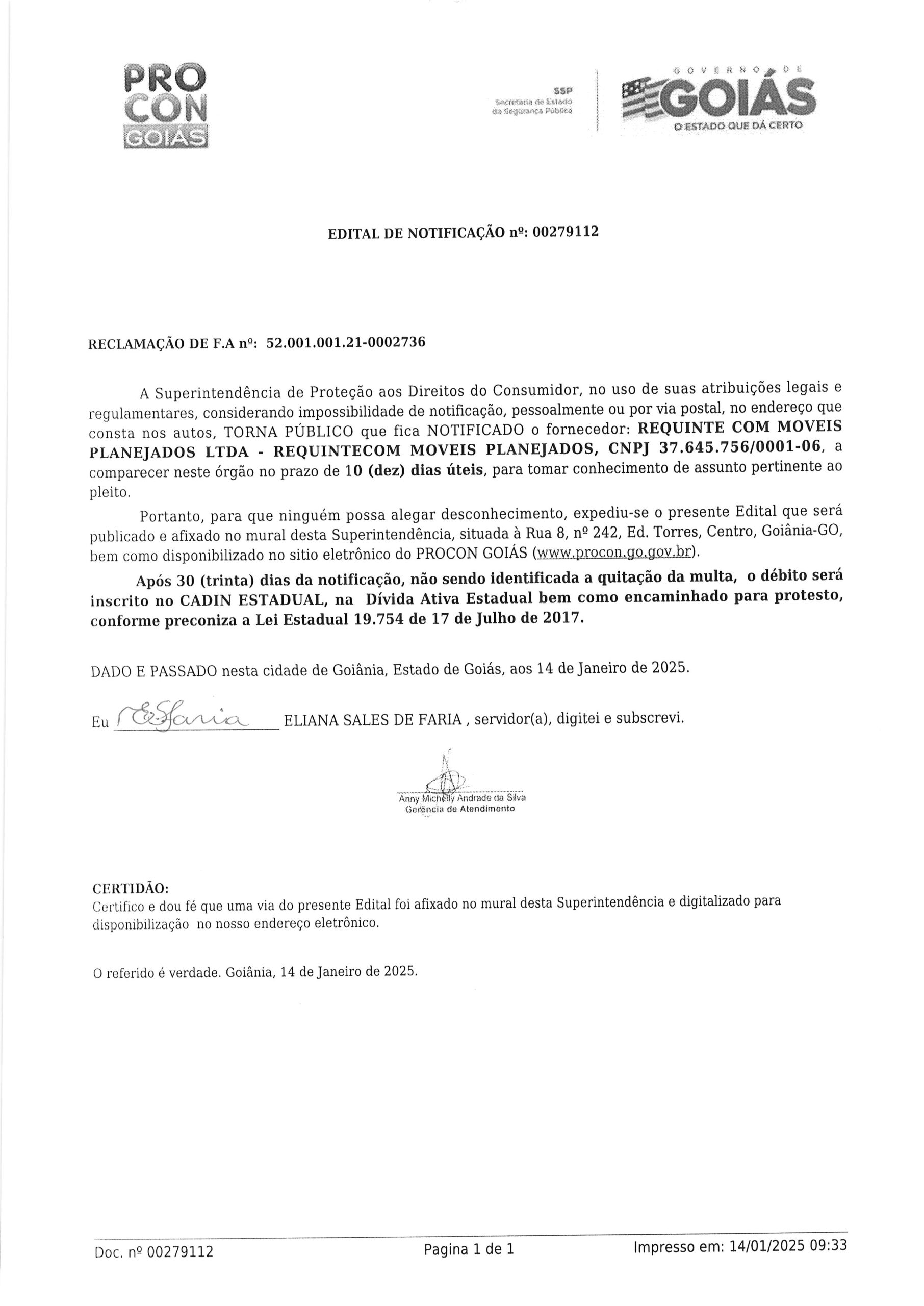 Edital de Notificação nº 00279112, Fornecedor REQUINTE COM MOVEIS PLANEJADOS LTDA Última Atualização em 21 de janeiro de 2025 Categoria Editais de Notificação, Fornecedor