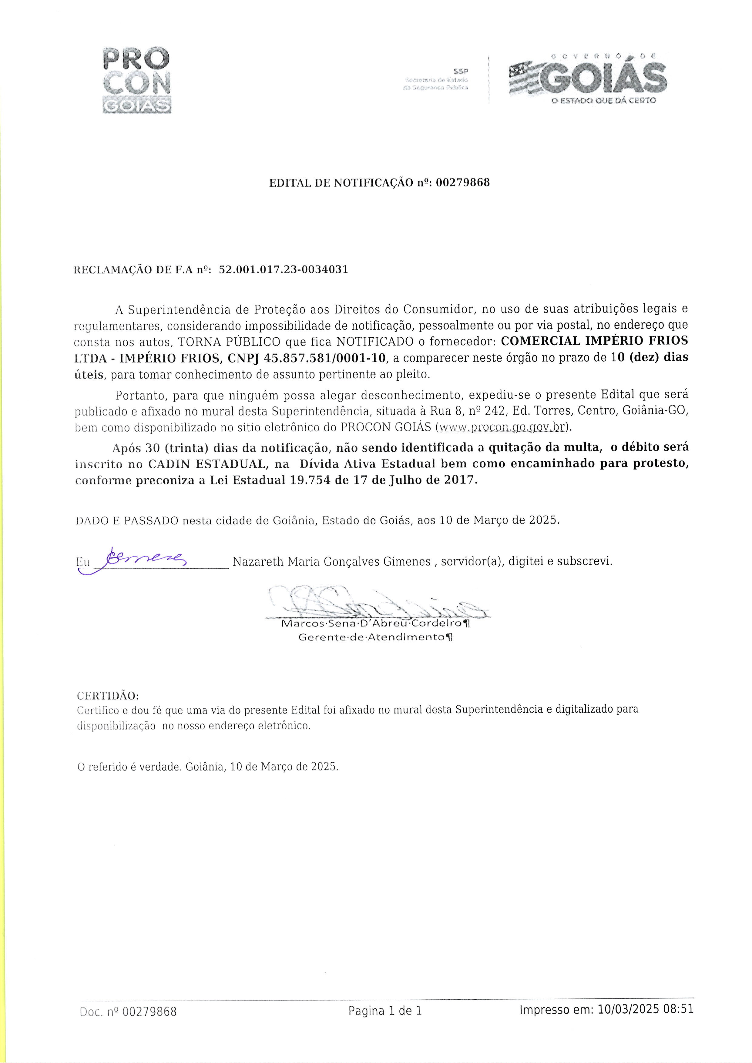 Edital de Notificação nº 00279868, Fornecedor COMERCIAL IMPÉRIO FRIOS LTDA Última Atualização em 8 de abril de 2025 Categoria Editais de Notificação, Fornecedor