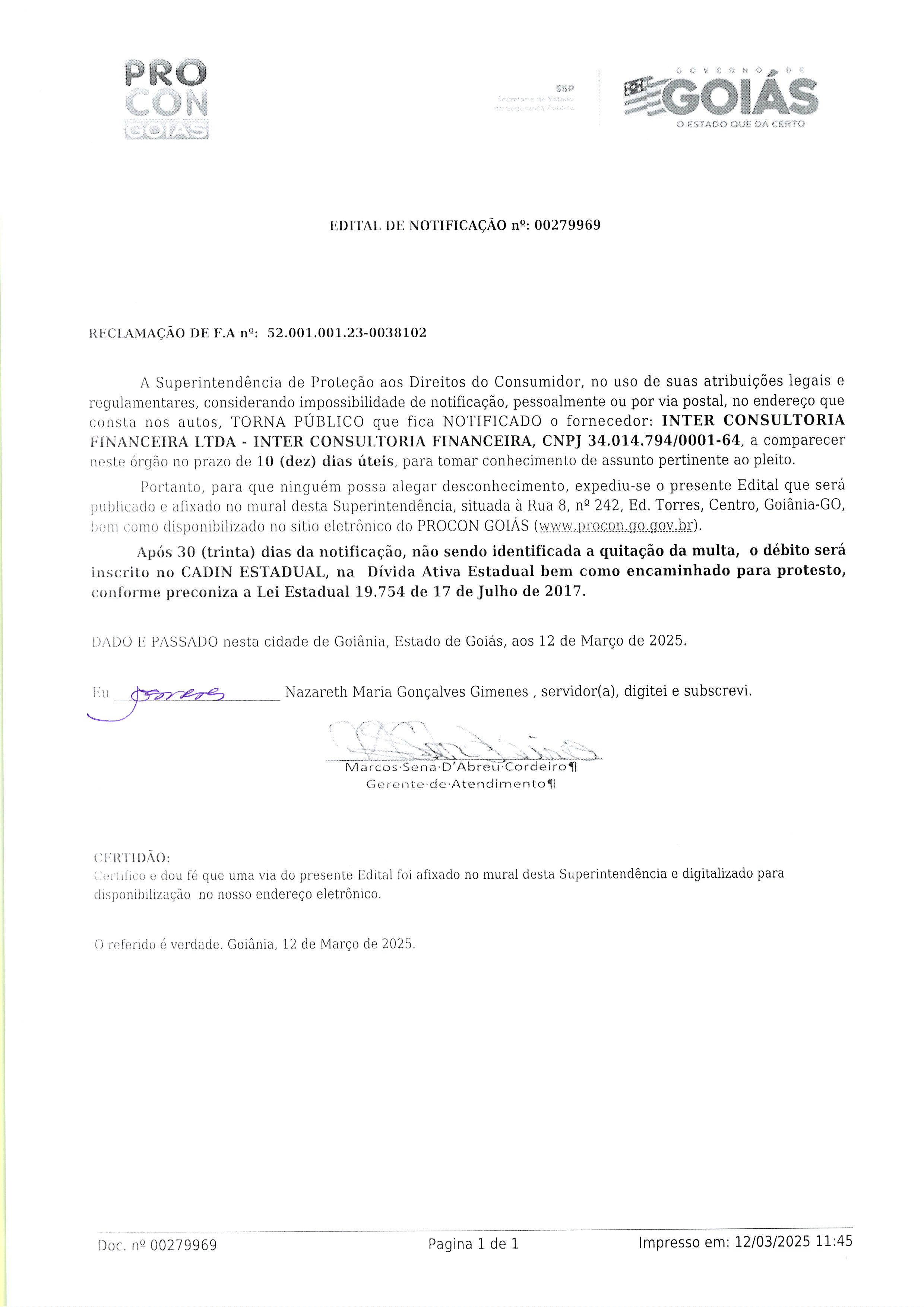 Edital de Notificação nº 00279969, Fornecedor INTER CONSULTORIA FINANCEIRA LTDA Última Atualização em 28 de março de 2025 Categoria Editais de Notificação, Fornecedor