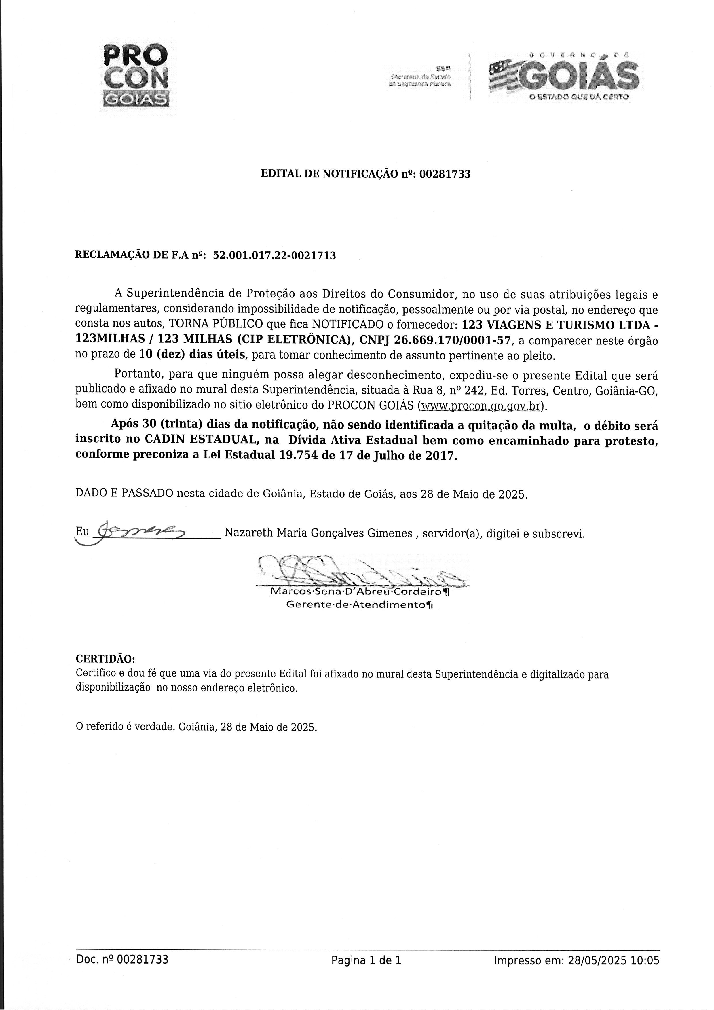 Edital de Notificação nº 00281713 , Fornecedor 123 VIAGENS E TURISMO LTDA Última Atualização em 2 de junho de 2025 Categoria Editais de Notificação, Fornecedor