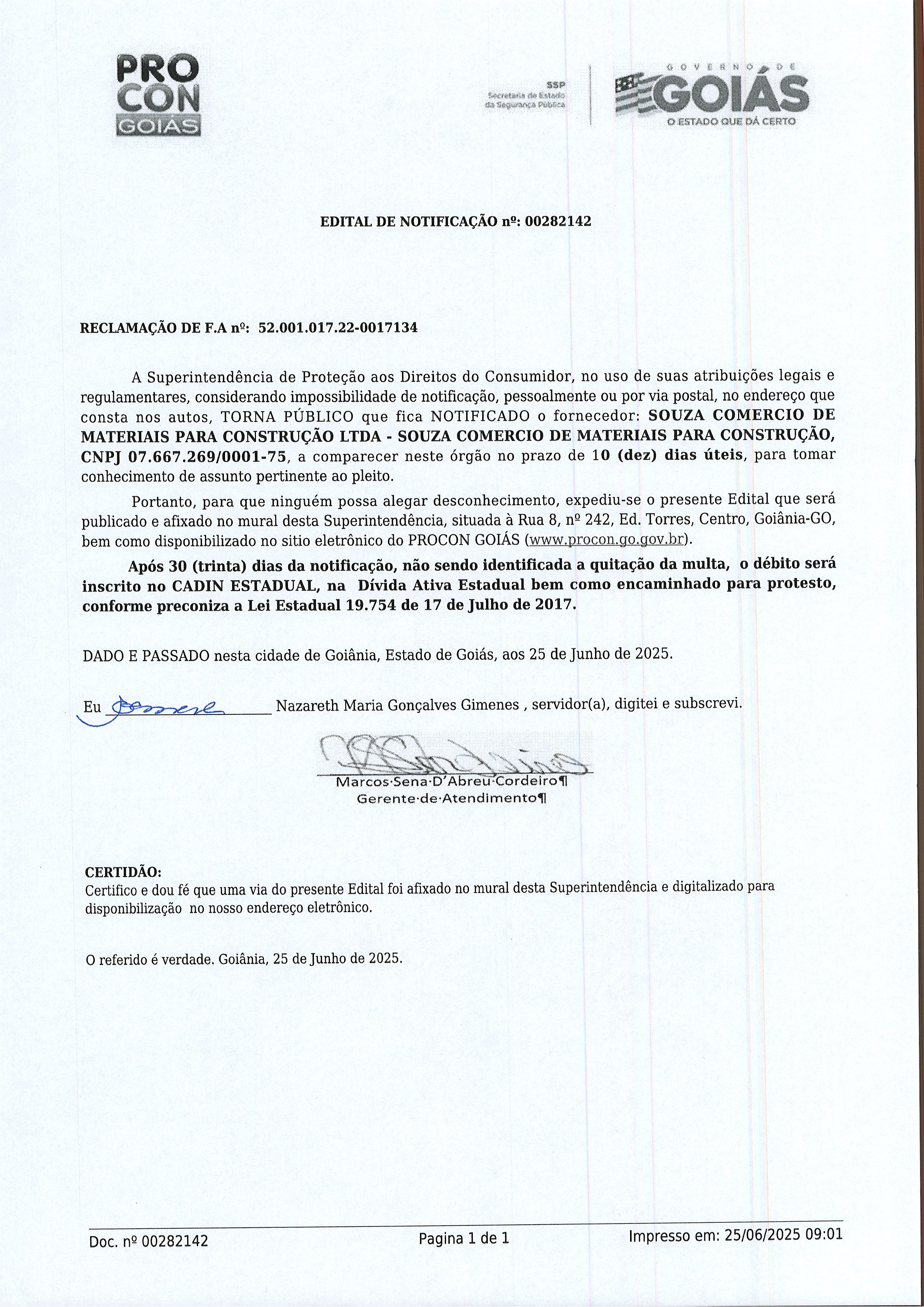 Edital de Notificação Nº 00282142 , Fornecedor SOUZA COMERCIO DE MATERIAIS PARA CONTRUÇÃO LTDA Última Atualização em 8 de julho de 2025 Categoria Editais de Notificação, Fornecedor