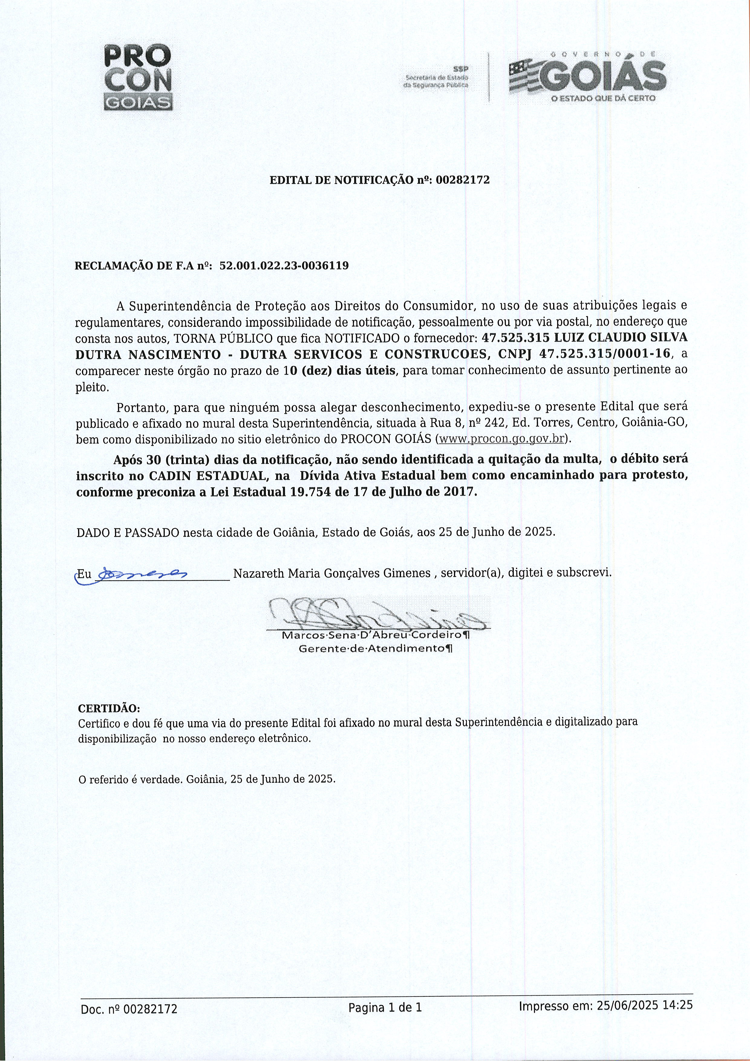 Edital de Notificação Nº 00282172 , Fornecedor LUIZ CLAUDIO SILVA D. NASCIMENTO Última Atualização em 8 de julho de 2025 Categoria Editais de Notificação, Fornecedor