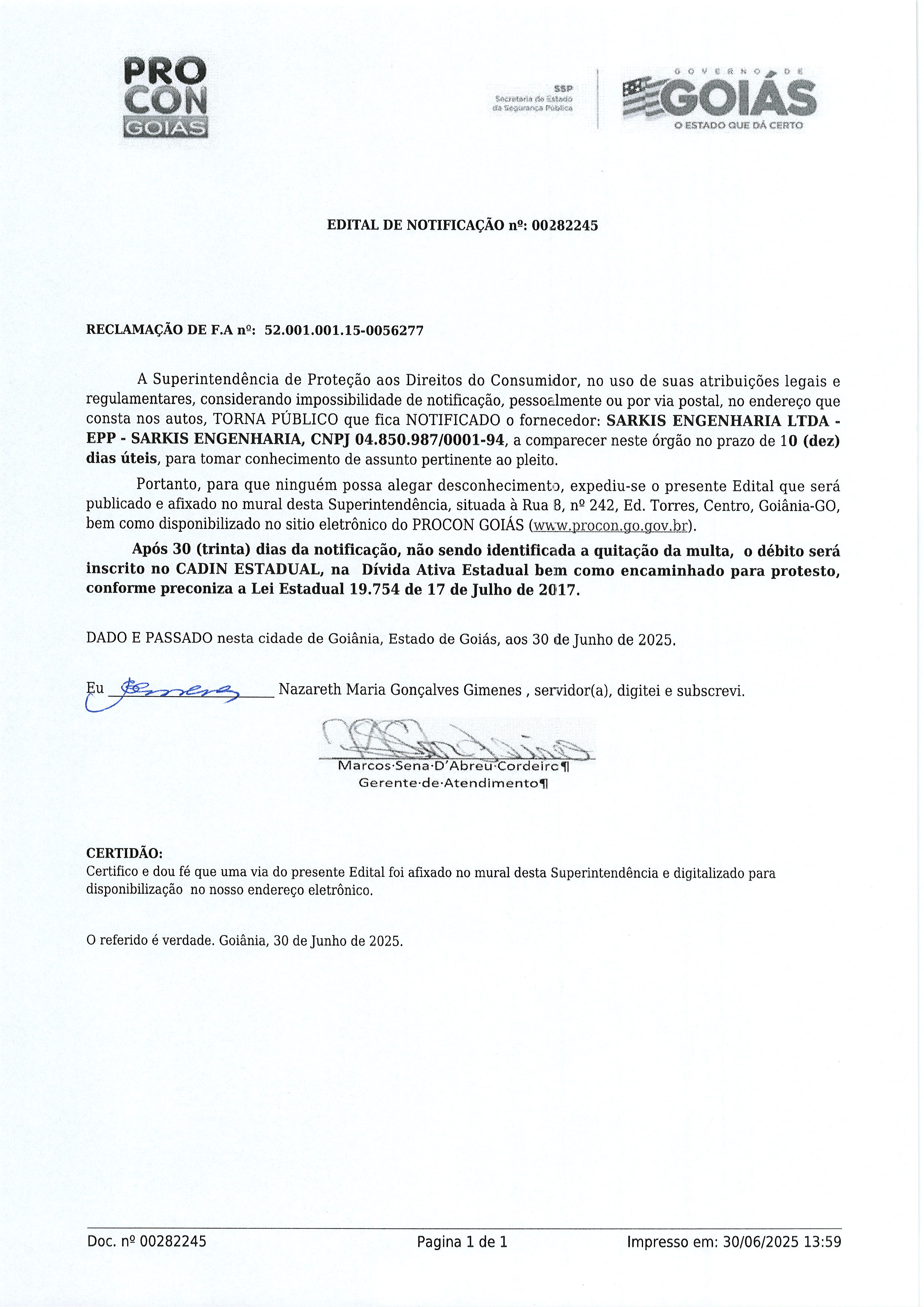 Edital de Notificação Nº 00282245, Fornecedor SARKIS ENGENHARIA LTDA Última Atualização em 8 de julho de 2025 Categoria Editais de Notificação, Fornecedor
