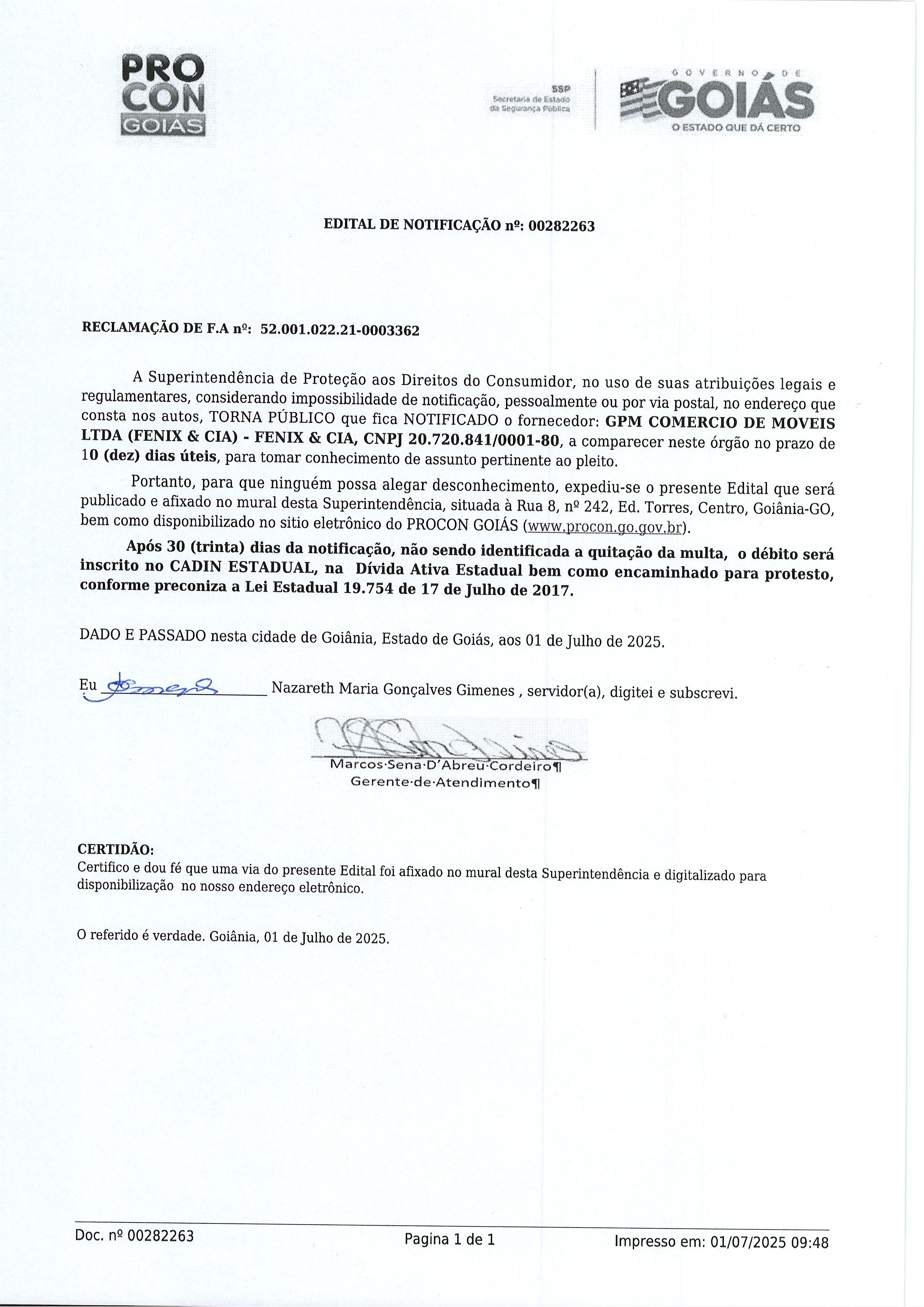 Edital de Notificação Nº 00282263 , Fornecedor GPM COMERCIO DE MOVEIS LTDA Última Atualização em 8 de julho de 2025 Categoria Editais de Notificação, Fornecedor