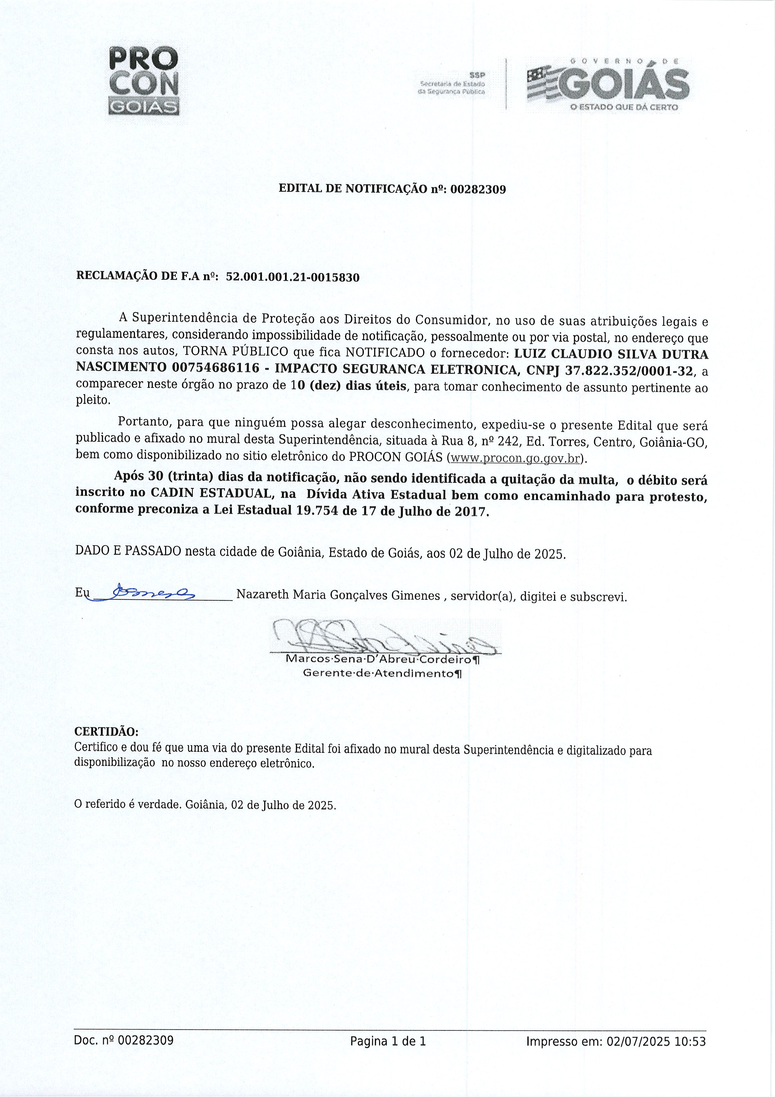 Edital de Notificação nº 00282309 , Fornecedor LUIZ CLAUDIO SILVA DUTRA NASCIMENTO Última Atualização em 3 de julho de 2025 Categoria Editais de Notificação, Fornecedor
