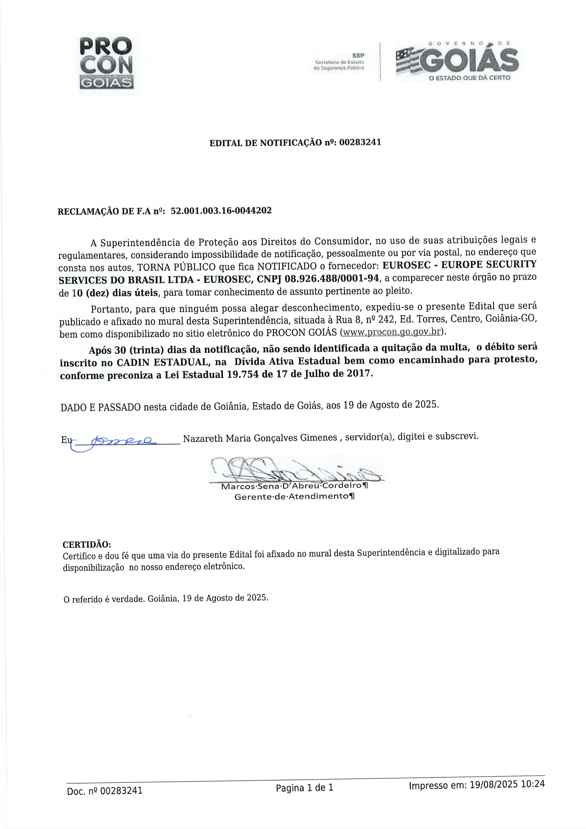 Edital de Notificação Nº 00283241 , Fornecedor EUROSEC – EUROPE SECURITY SERVICES DO BRASIL LTDA Última Atualização em 3 de setembro de 2025 Categoria Editais de Notificação, Fornecedor