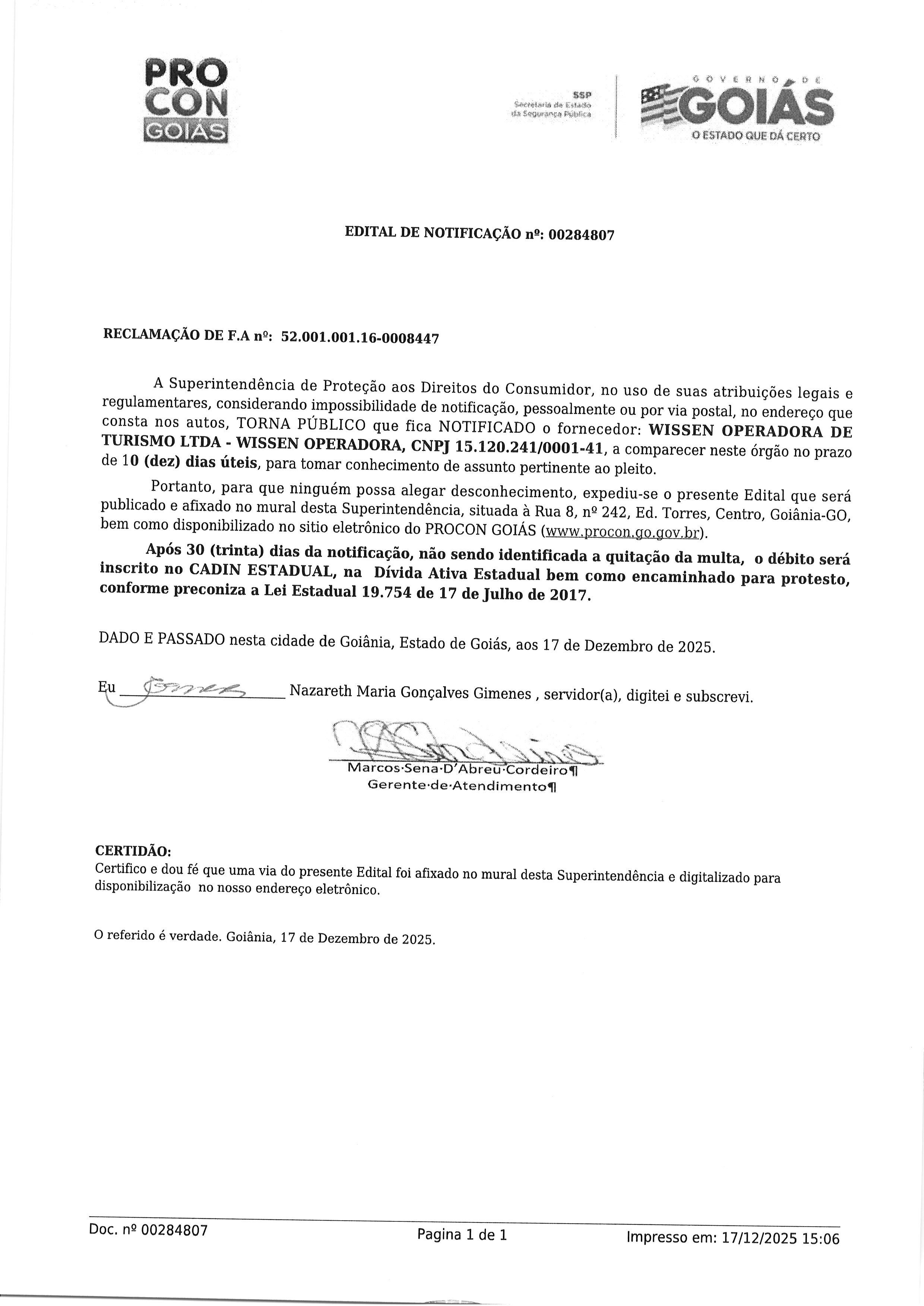 EDITAL DE NOTIFICAÇAO Nº 00284807, CONSUMIDOR WISSEN OPERADORA DE TURISMO LTDA Última Atualização em 14 de janeiro de 2026 Categoria Consumidores, Editais de Notificação