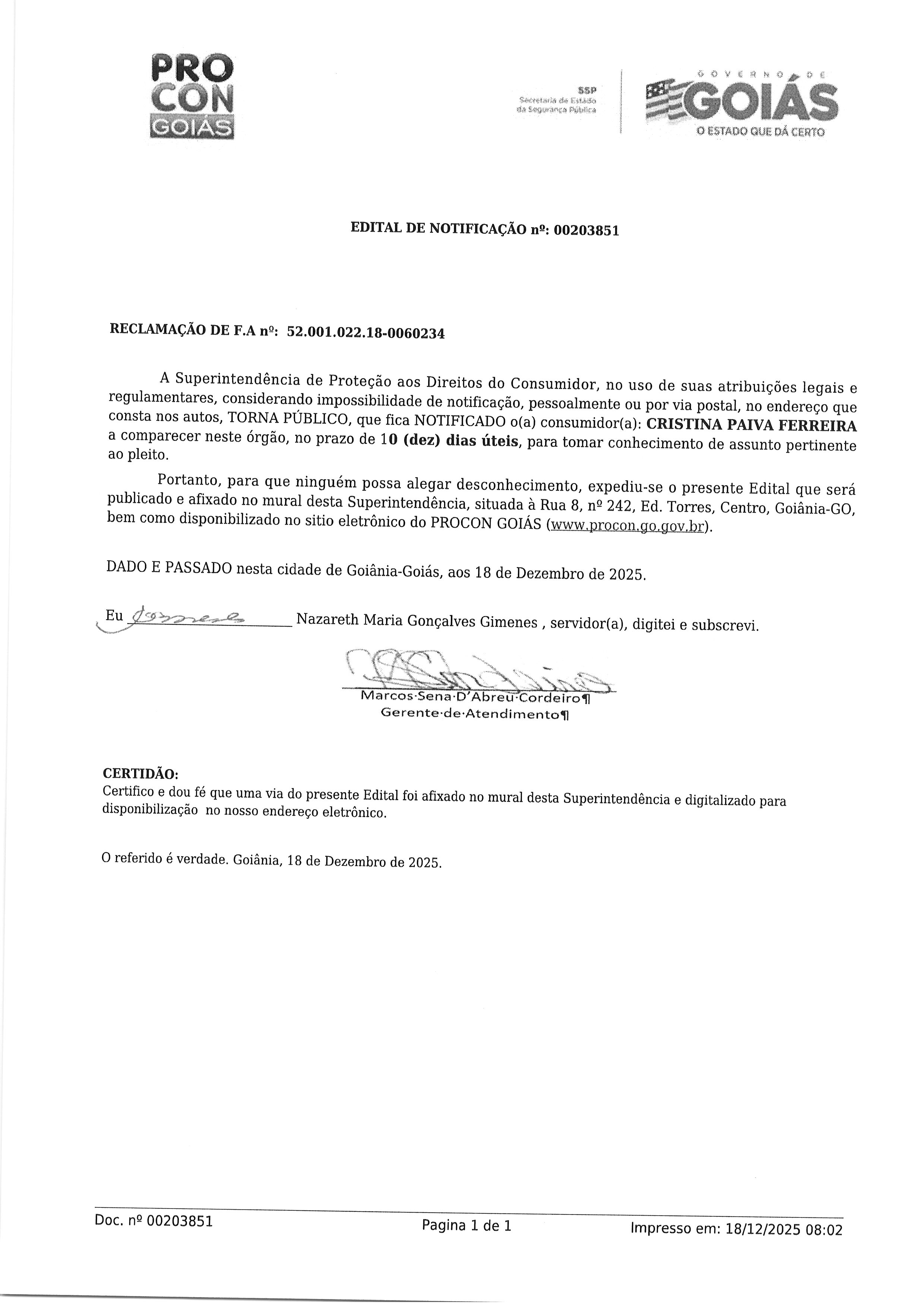 EDITAL DE NOTIFICAÇÃO Nº 0203851, CONSUMIDOR CRISTINA PAIVA FERREIRA Última Atualização em 21 de janeiro de 2026 Categoria Consumidor, Editais de Notificação