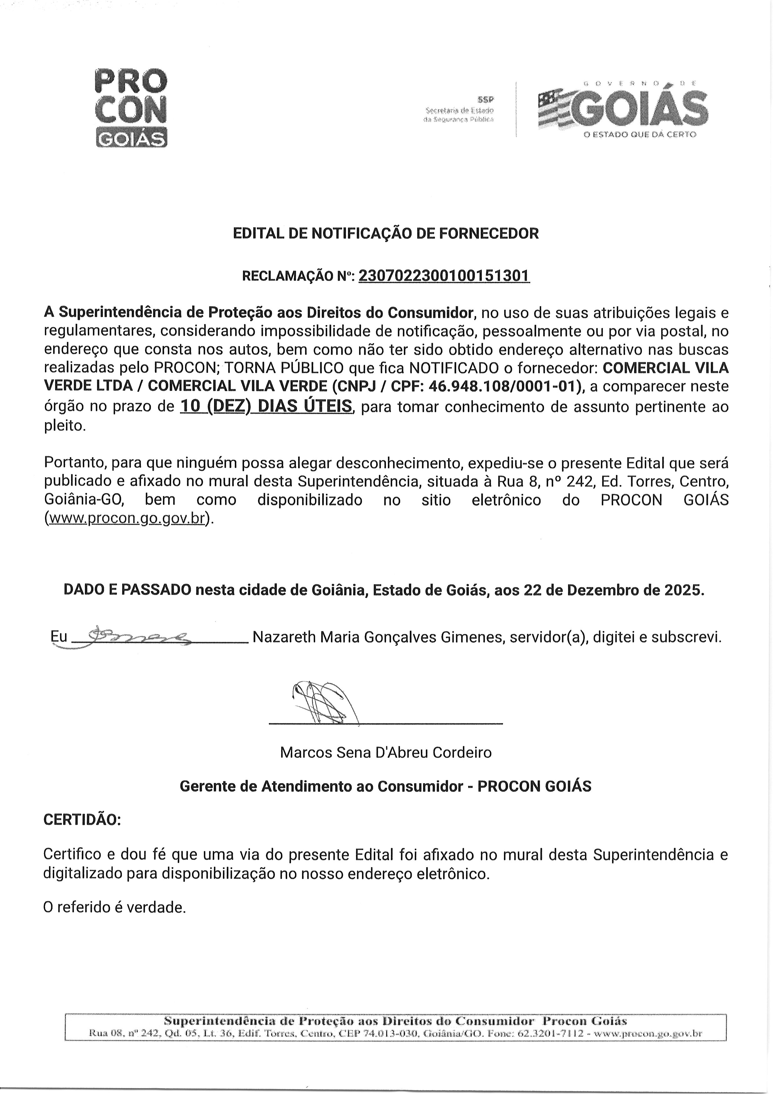 EDITAL DE NOTIFICAÇÃO Nº 2307022300100151301, FORNECEDOR COMERCIAL VILA VERDE Última Atualização em 19 de janeiro de 2026 Categoria Editais de Notificação, Fornecedor