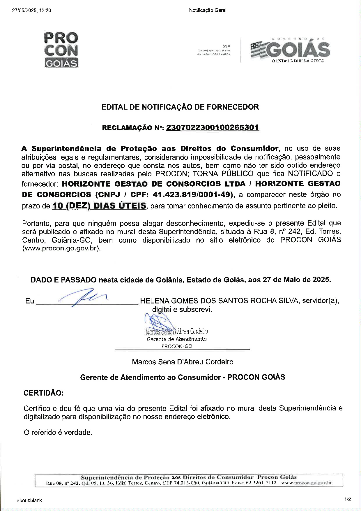 Edital de notificação Nº 2307022300100265301 , Fornecedor HORIZONTE GESTAO DE CONSORCIOS LTDA Última Atualização em 28 de maio de 2025 Categoria Editais de Notificação, Fornecedor