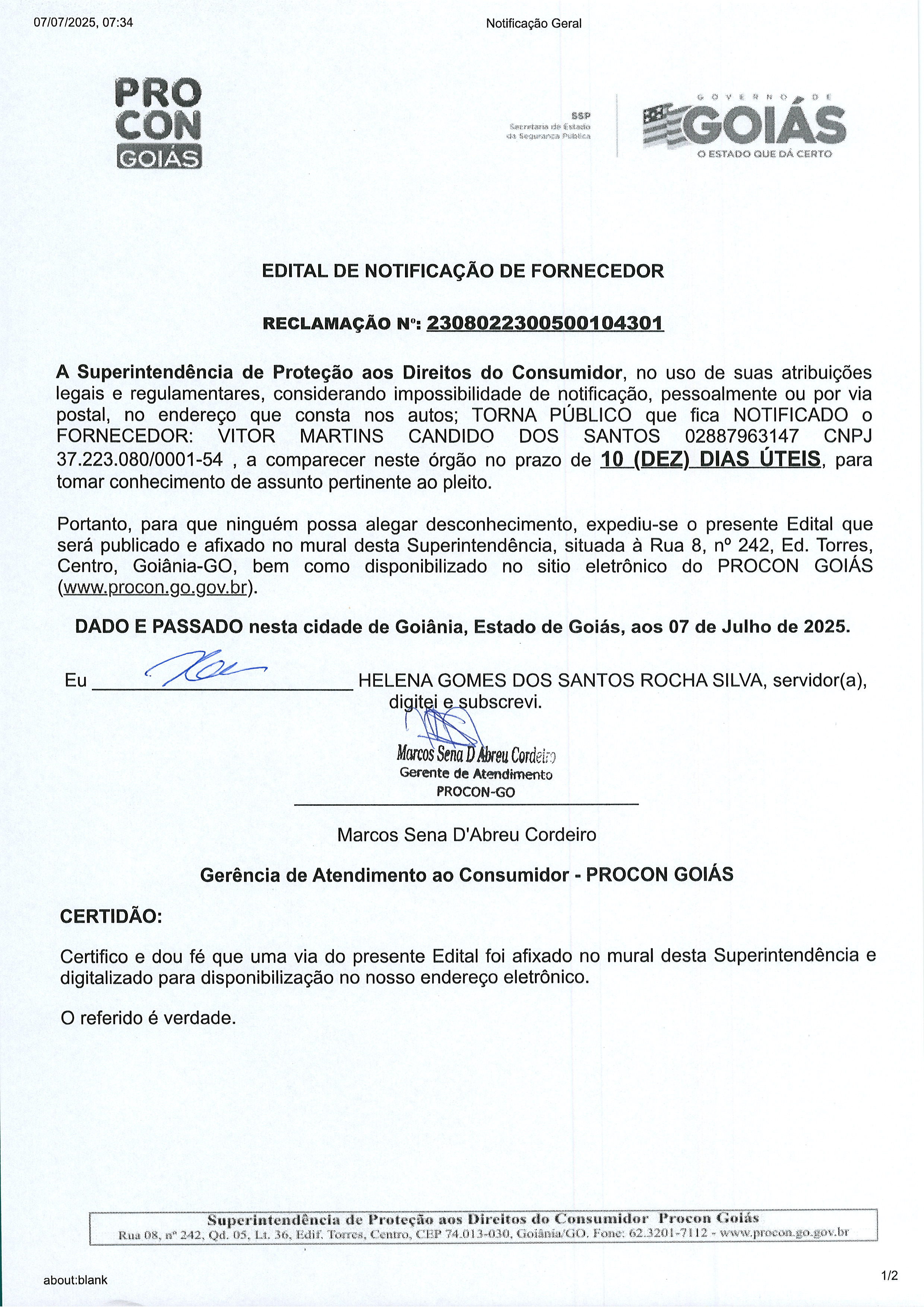 Edital de Notificação Nº 2308022300500104301 , Fornecedor VITOR MARTINS CANDIDO DOS SANTOS Última Atualização em 14 de julho de 2025 Categoria Editais de Notificação, Fornecedor