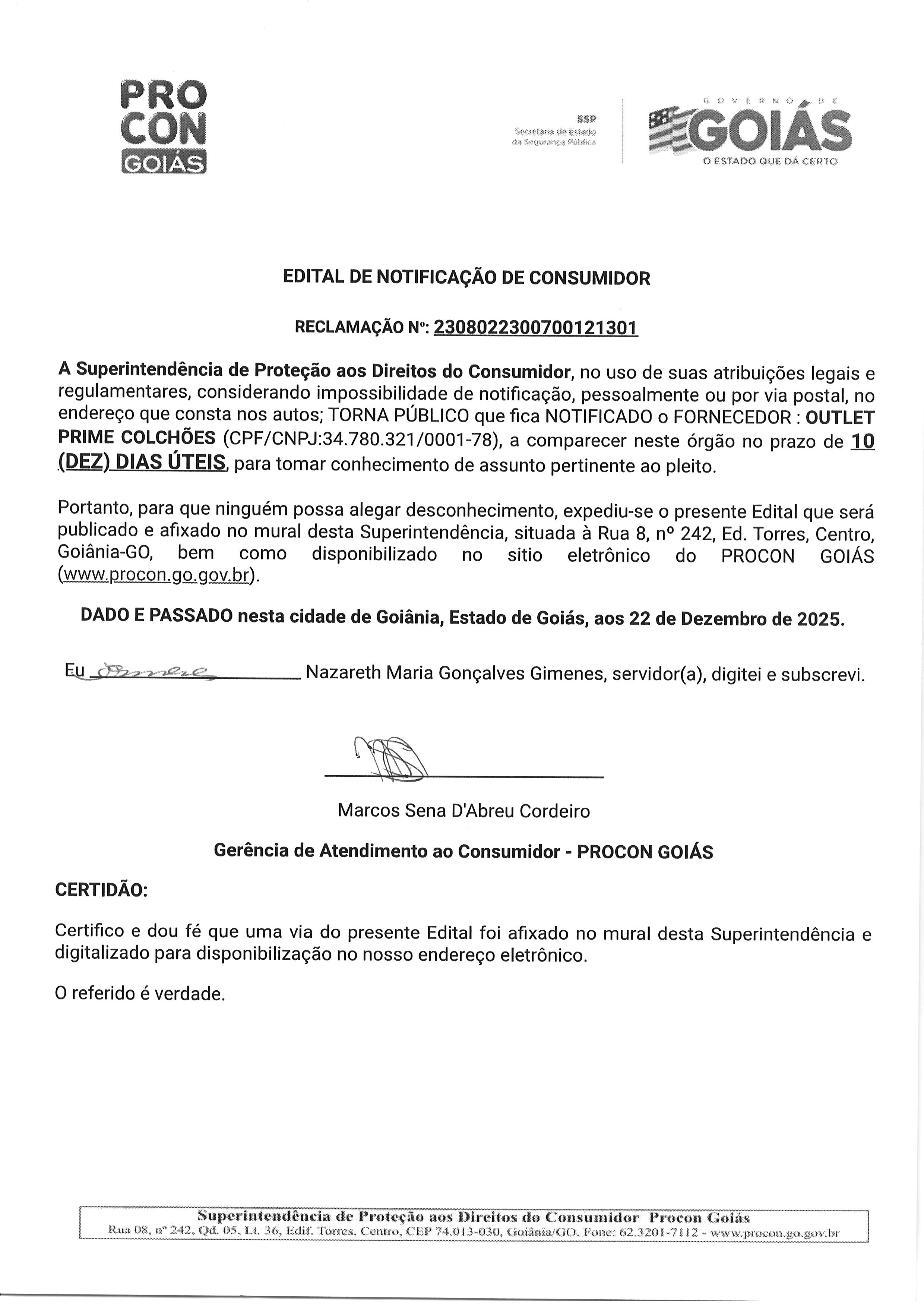 EDITAL DE NOTIFICAÇÃO Nº 2308022300700121301, FORNECEDOR OUTLET PRIME COLCHÕES Última Atualização em 19 de janeiro de 2026 Categoria Editais de Notificação, Fornecedor