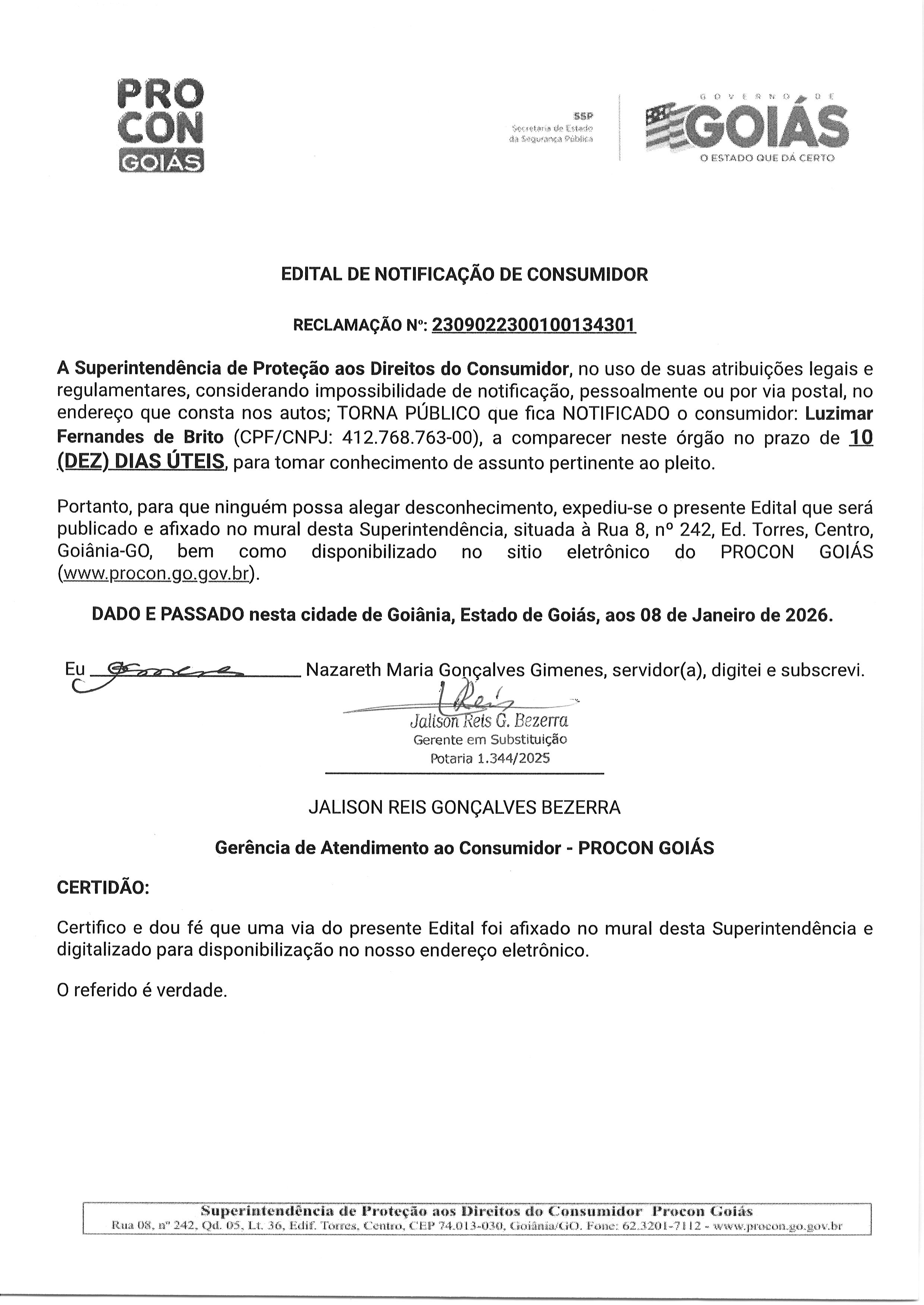EDITAL DE NOTIFICAÇÃO Nº 2309022300100134301, CONSUMIDOR LUZIMAR FERNANDES DE BRITO Última Atualização em 21 de janeiro de 2026 Categoria Consumidor, Editais de Notificação