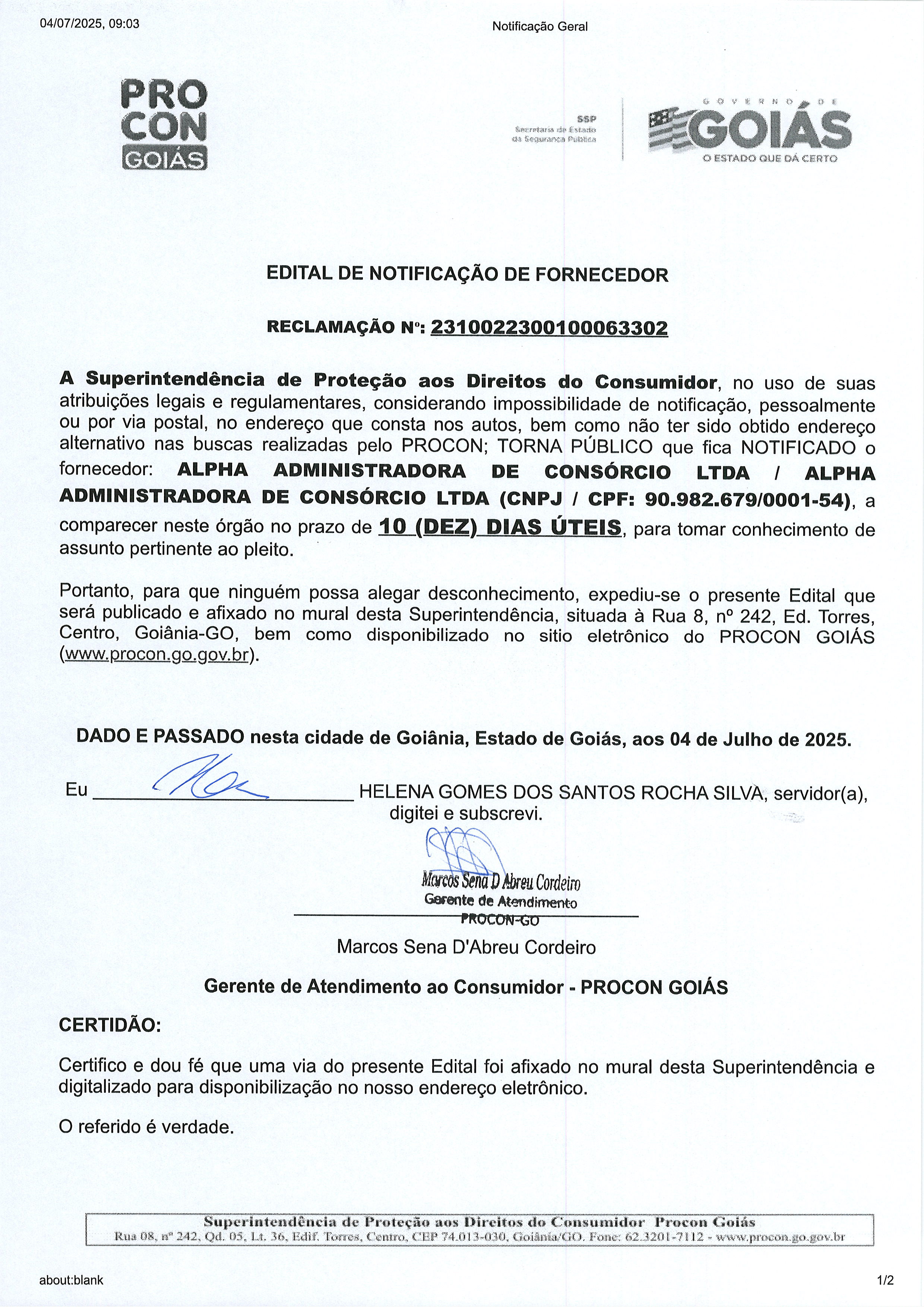 Edital de Notificação Nº 2310022300100063302 , Fornecedor ALPHA ADMINISTRADORA DE CONSÓRCIO LTDA Última Atualização em 9 de julho de 2025 Categoria Editais de Notificação, Fornecedor