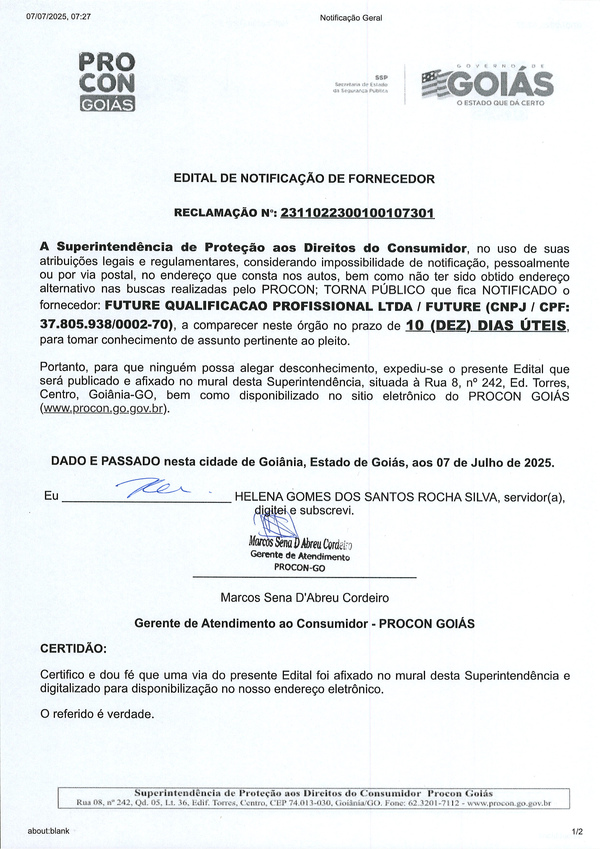 Edital de Notificação Nº 2311022300100107301 , Fornecedor FUTURE QUALIFICAÇÃO P. LTDA Última Atualização em 14 de julho de 2025 Categoria Editais de Notificação, Fornecedor