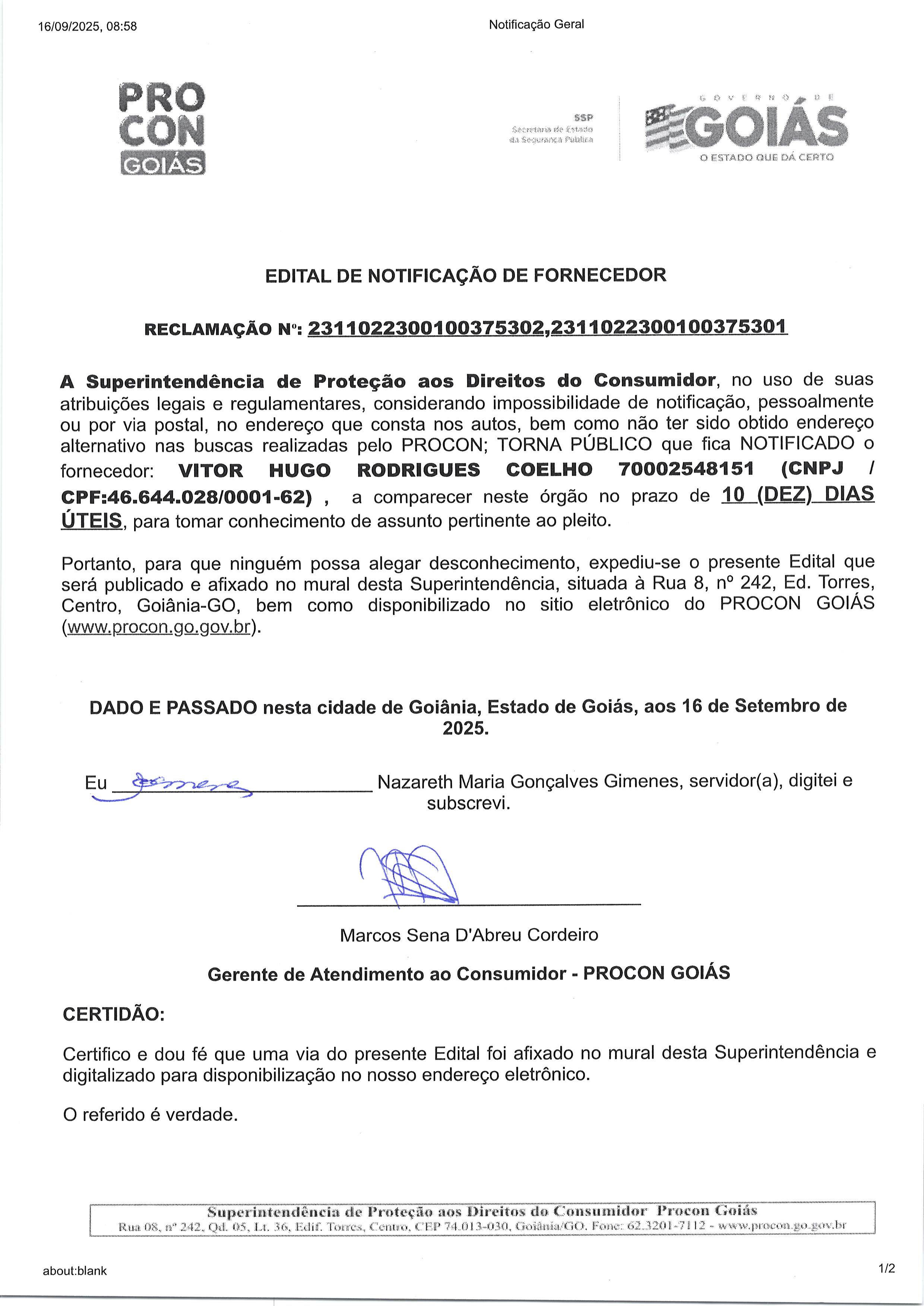 EDITAL DE NOTIFICAÇÃO Nº 2311022300100275301 , Fornecedor VITOR HUGO RODRIGUES COELHO Última Atualização em 6 de outubro de 2025 Categoria Editais de Notificação, Fornecedor