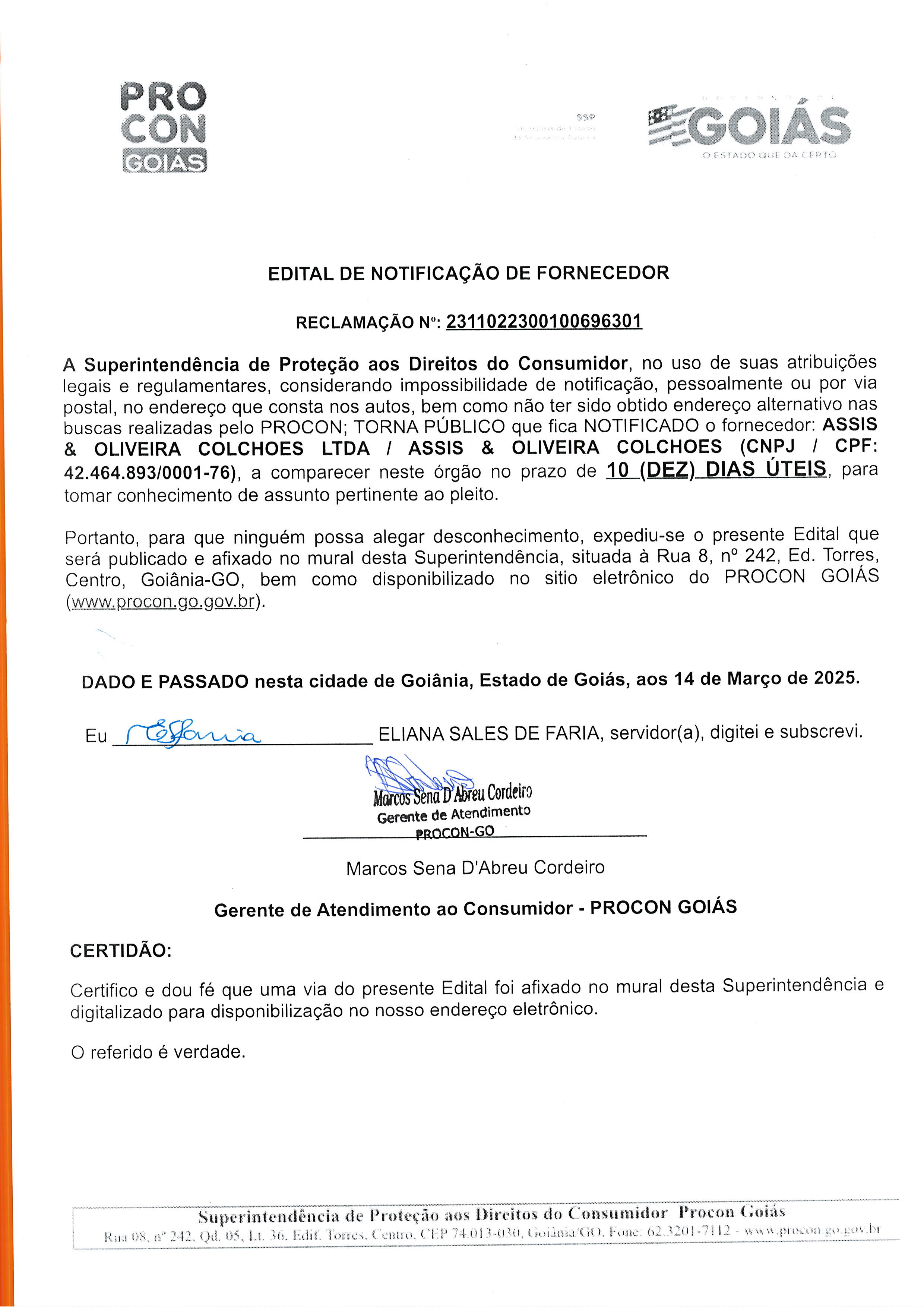 Edital de Notificação nº 2311022300100696301, Fornecedor ASSIS & OLIVEIRA COLCHOES LTDA Última Atualização em 26 de março de 2025 Categoria Editais de Notificação, Fornecedor