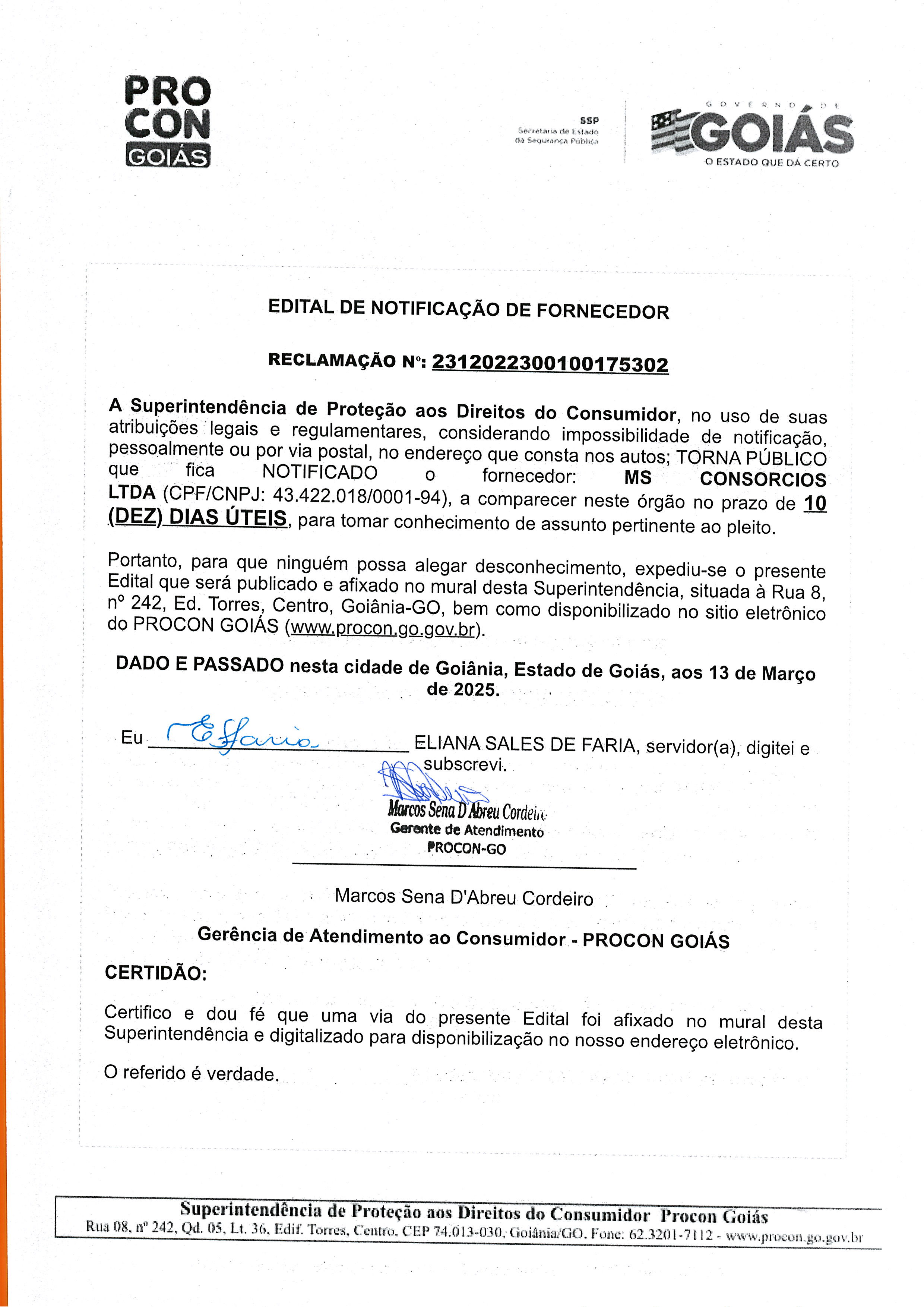 Edital de Notificação nº 2312022300100175302, Fornecedor MS CONSORCIOS LTDA Última Atualização em 25 de março de 2025 Categoria Editais de Notificação, Fornecedor