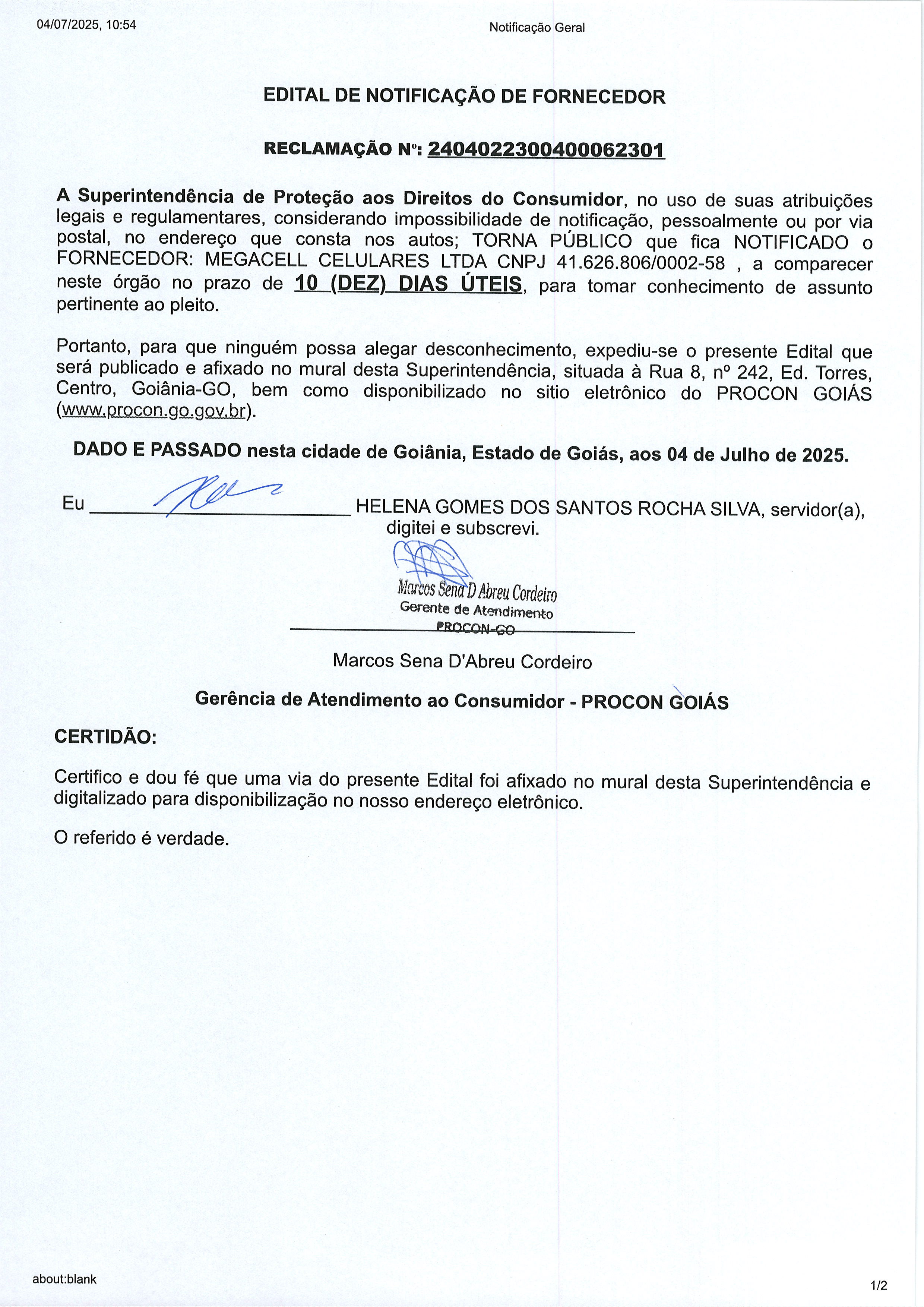 Edital de Notificação Nº 2404022300400062301, Fornecedor MEGACELL CELULARES LTDA Última Atualização em 10 de julho de 2025 Categoria Editais de Notificação, Fornecedor