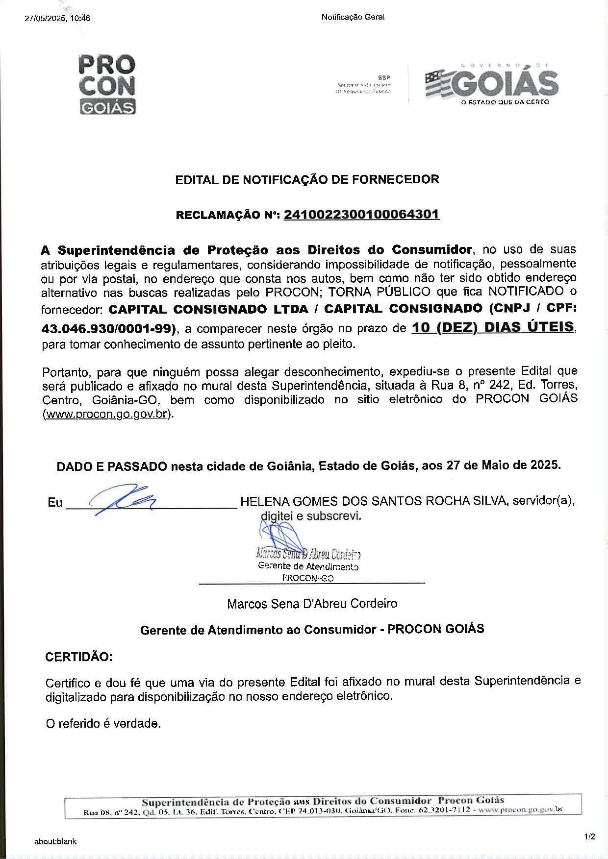 Edital de notificação Nº 2410022300100064301 , Fornecedor CAPITAL CONSIGNADO LTDA Última Atualização em 28 de maio de 2025 Categoria Consultar processos, Fornecedores