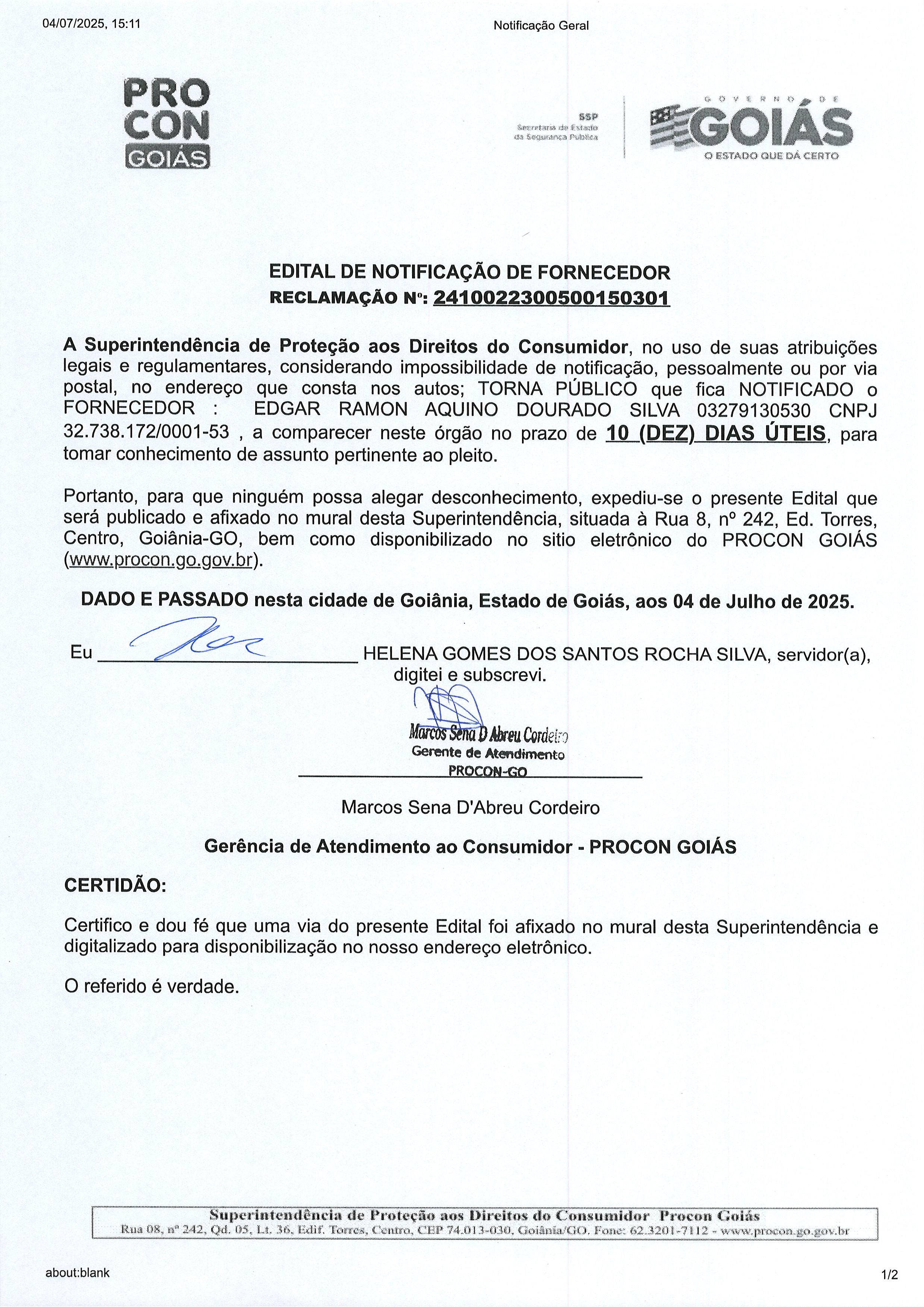 Edital de Notificação Nº 2410022300500150301 , Fornecedor EDGAR RAMON AQUINO DOURAD SILVA Última Atualização em 14 de julho de 2025 Categoria Editais de Notificação, Fornecedor