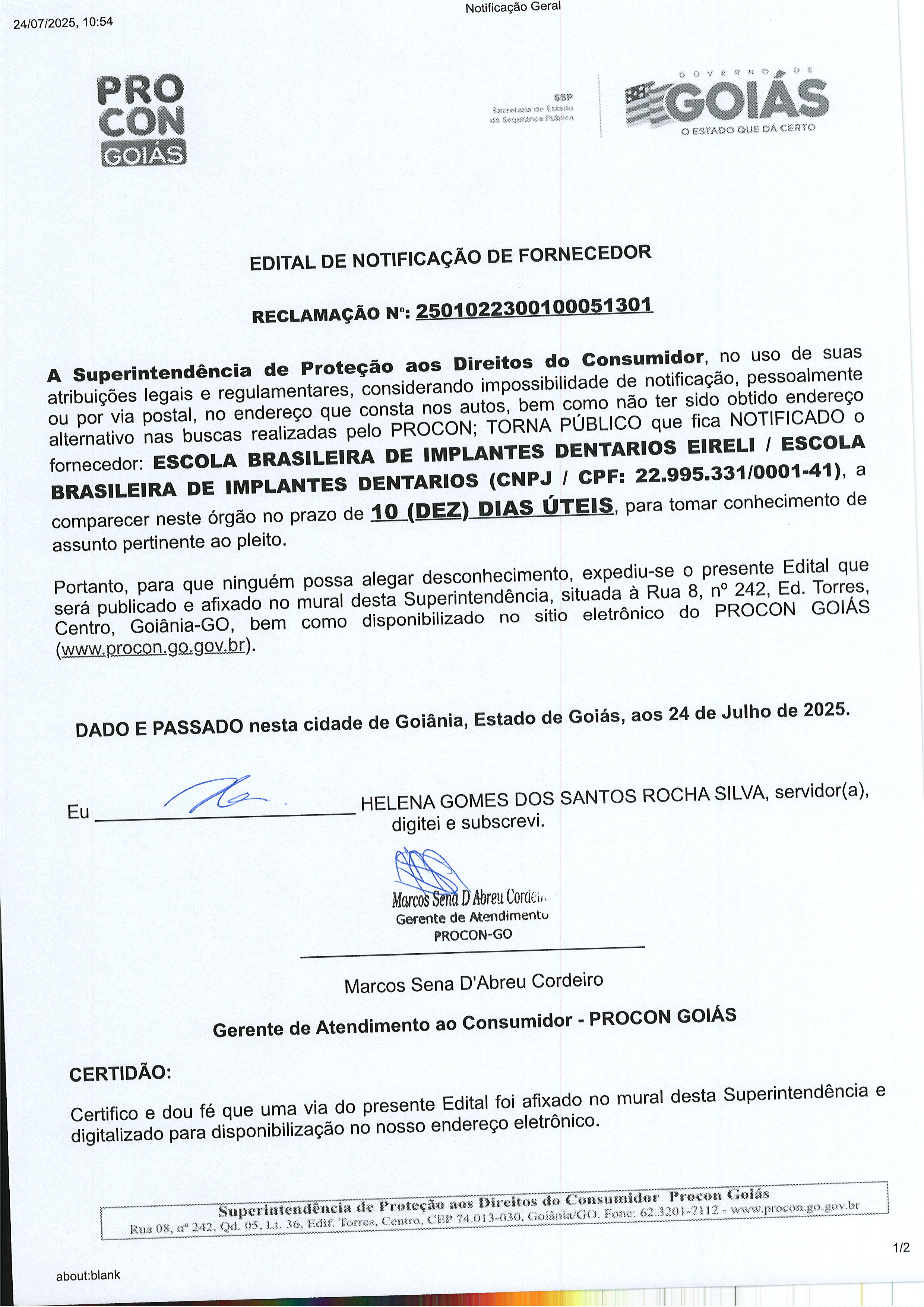 Edital de Notificação Nº 2501022300100051301, Fornecedor ESCOLA BRASILEIRA DE IMPLANTES DENTARIOS EIRELI Última Atualização em 30 de julho de 2025 Categoria Consultar processos, Fornecedores