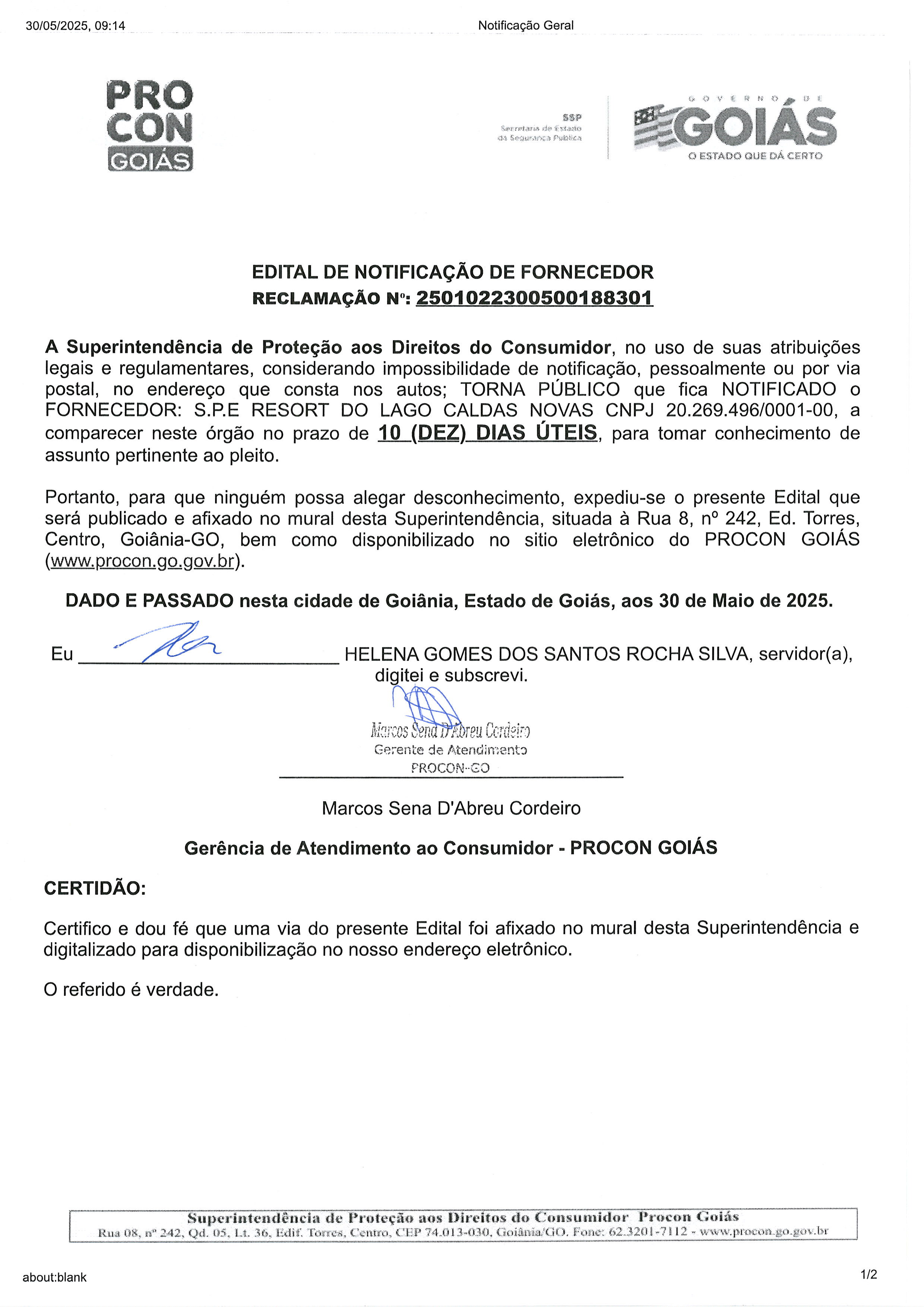 Edital de Notificação Nº 2501022300500188301, Fornecedor S.P.E RESORT DO LAGO CALDAS NOVAS Última Atualização em 6 de junho de 2025 Categoria Editais de Notificação, Fornecedor