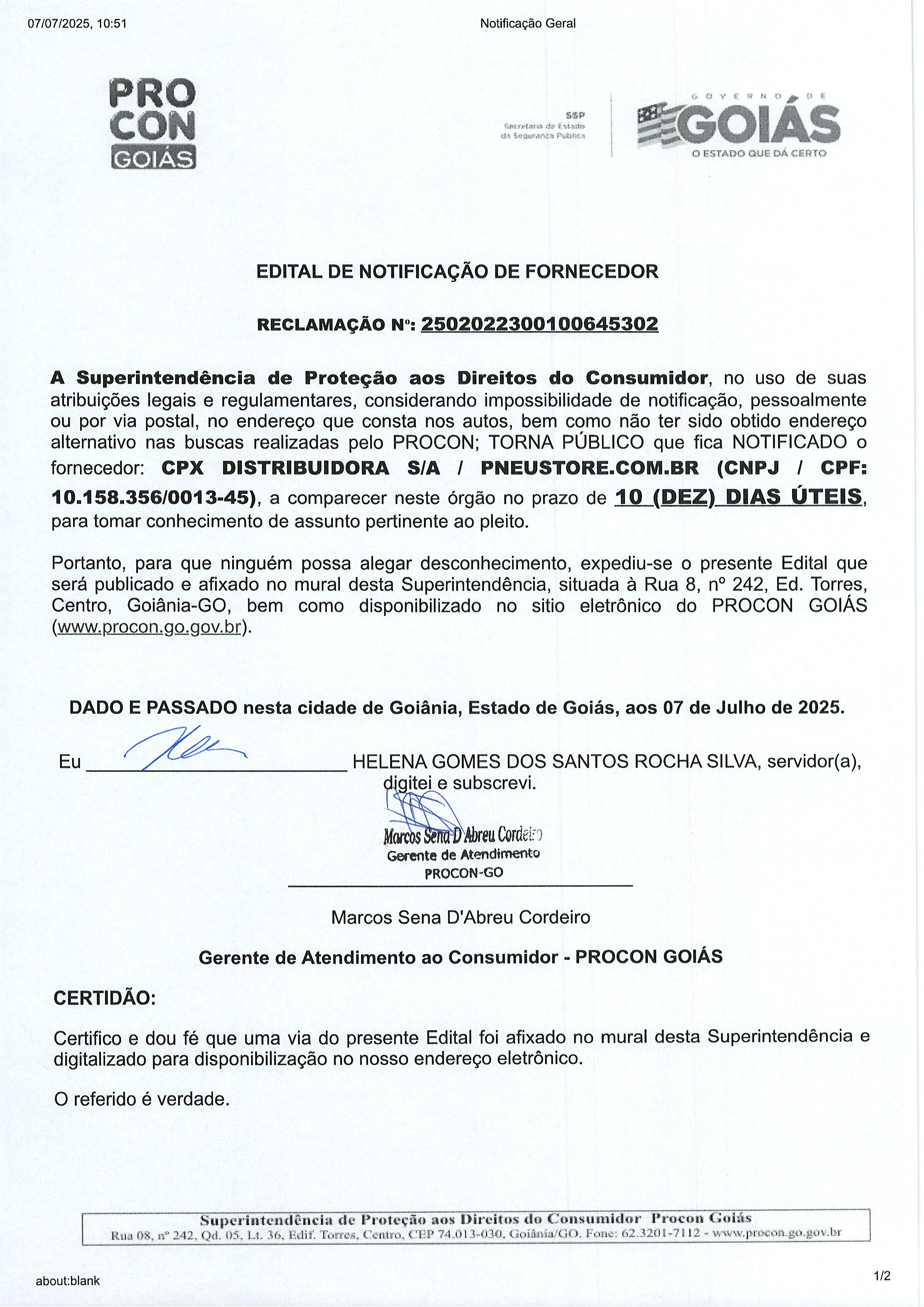 Edital de Notificação Nº 2502022300100645302 , Fornecedor CPX DISTRIBUIDORA SA Última Atualização em 14 de julho de 2025 Categoria Editais de Notificação, Fornecedor