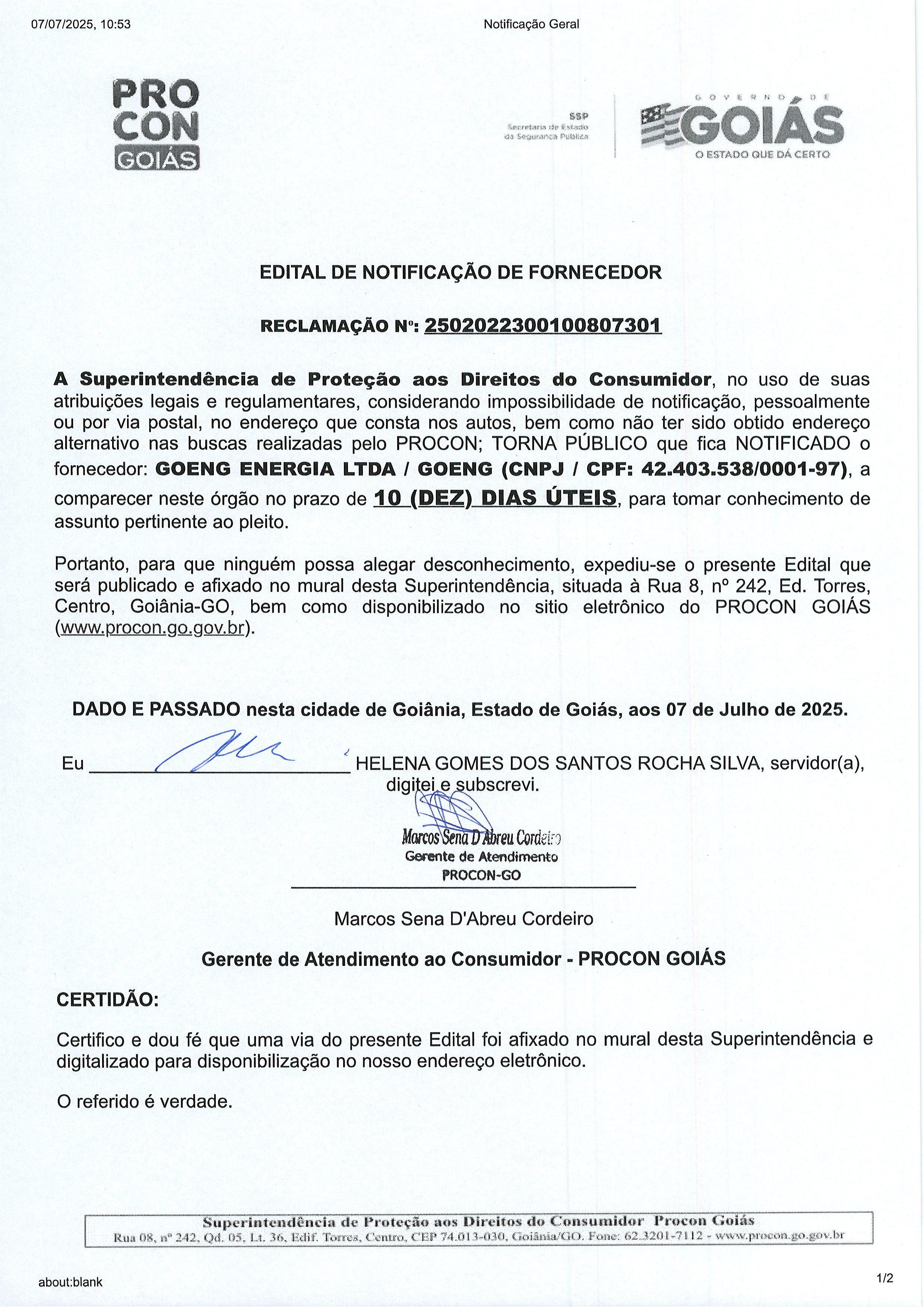 Edital de Notificação Nº 2502022300100807301 , Fornecedor GOENG ENERGIA LTDA Última Atualização em 14 de julho de 2025 Categoria Editais de Notificação, Fornecedor