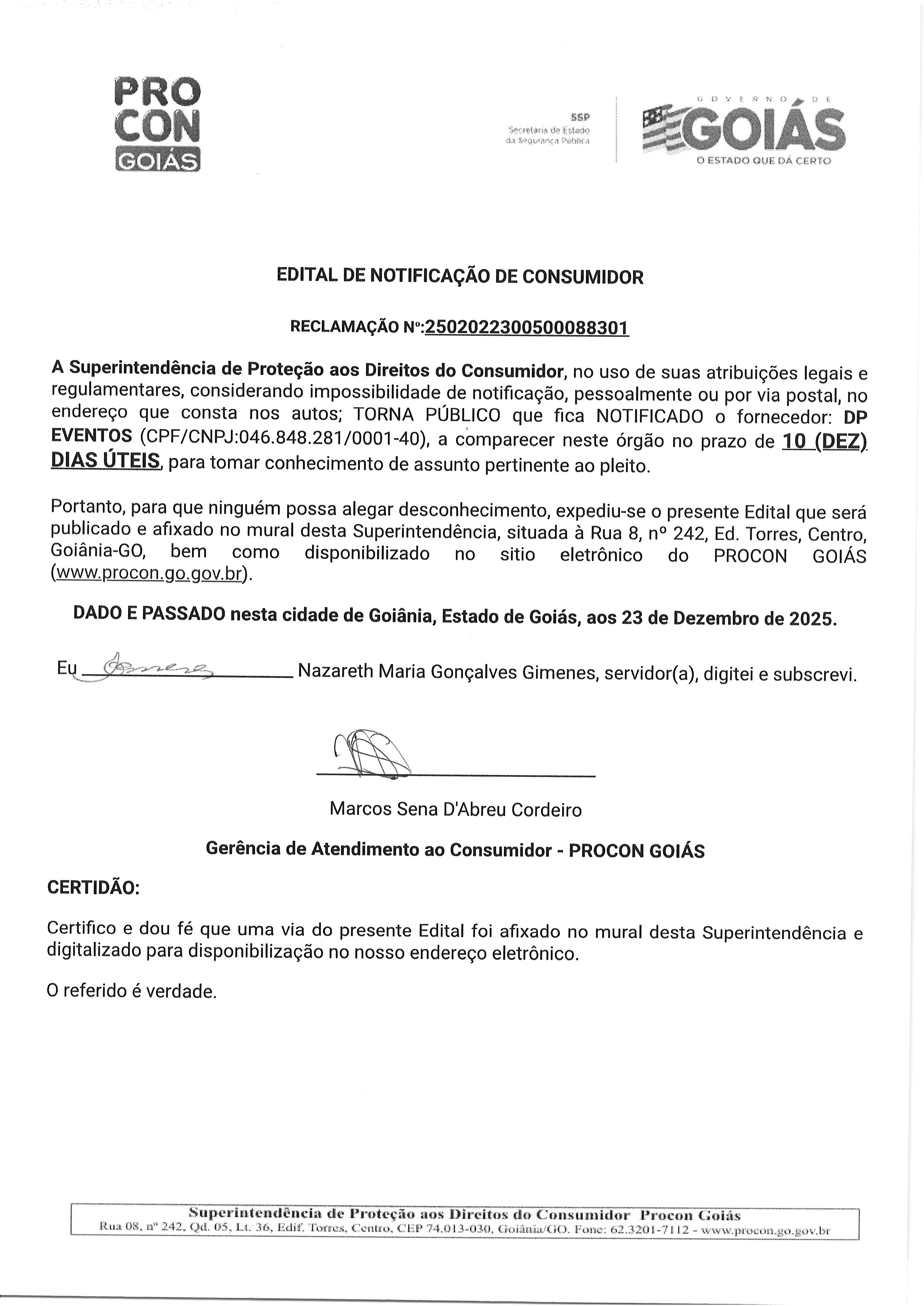 EDITAL DE NOTIFICAÇÃO Nº 2502022300500088301, FORNECEDOR DP EVENTOS Última Atualização em 27 de janeiro de 2026 Categoria Editais de Notificação, Fornecedor