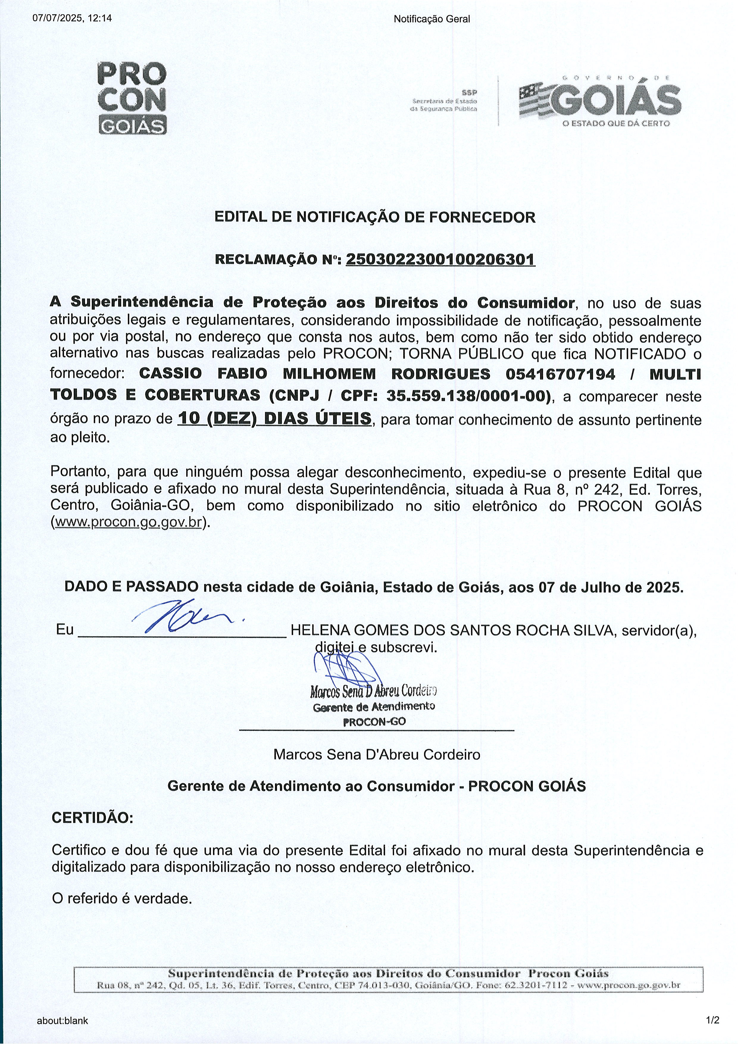 Edital de Notificação Nº 2503022300100206301 , Fornecedor CASSIO FABIO MILHOMEM RODRIGUES Última Atualização em 14 de julho de 2025 Categoria Editais de Notificação, Fornecedor