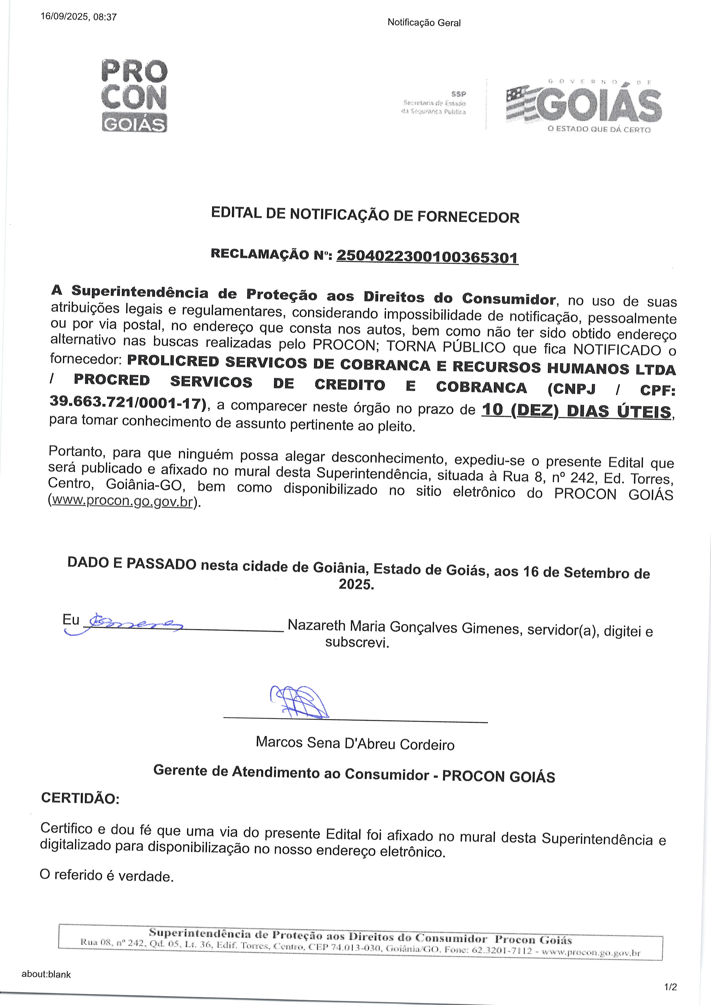 EDITAL DE NOTIFICAÇÃO Nº 2504022300160365301 , Fornecedor PROLICRED SERVICOS DE COBRANCA E RECURSOS HUMANOS LTDA Última Atualização em 6 de outubro de 2025 Categoria Editais de Notificação, Fornecedor