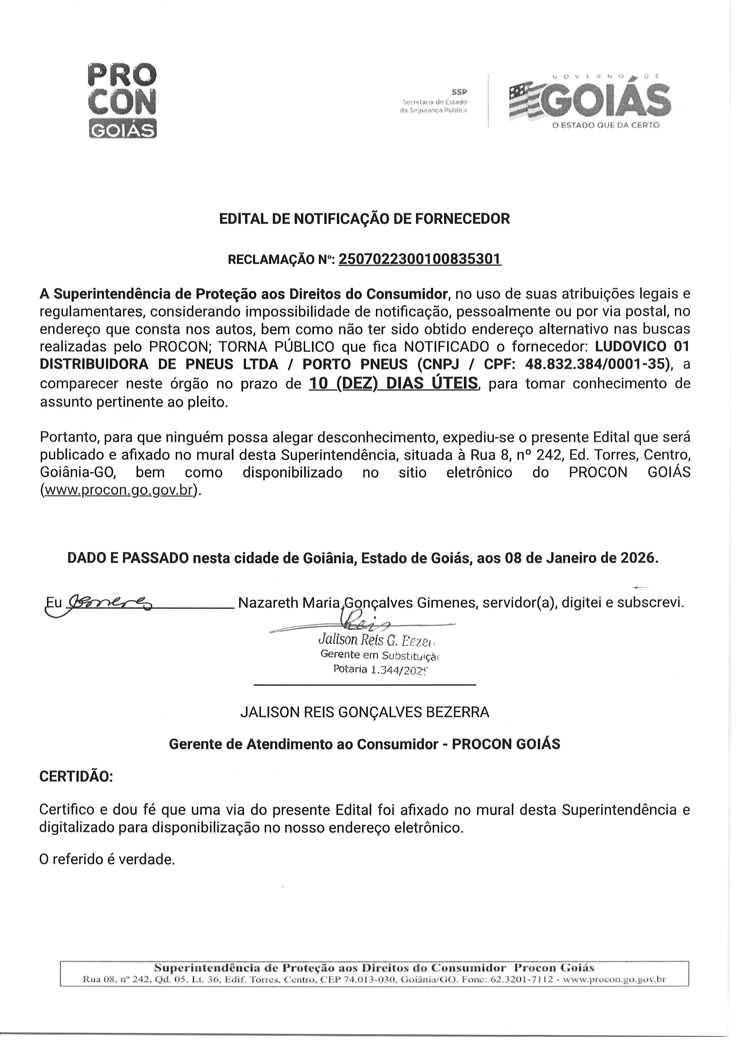EDITAL DE NOTIFICAÇÃO Nº 2507022300100835301, FORNECEDOR LUDOVICO 01 DISTRIB. DE PNEUS LTDA Última Atualização em 27 de janeiro de 2026 Categoria Editais de Notificação, Fornecedor