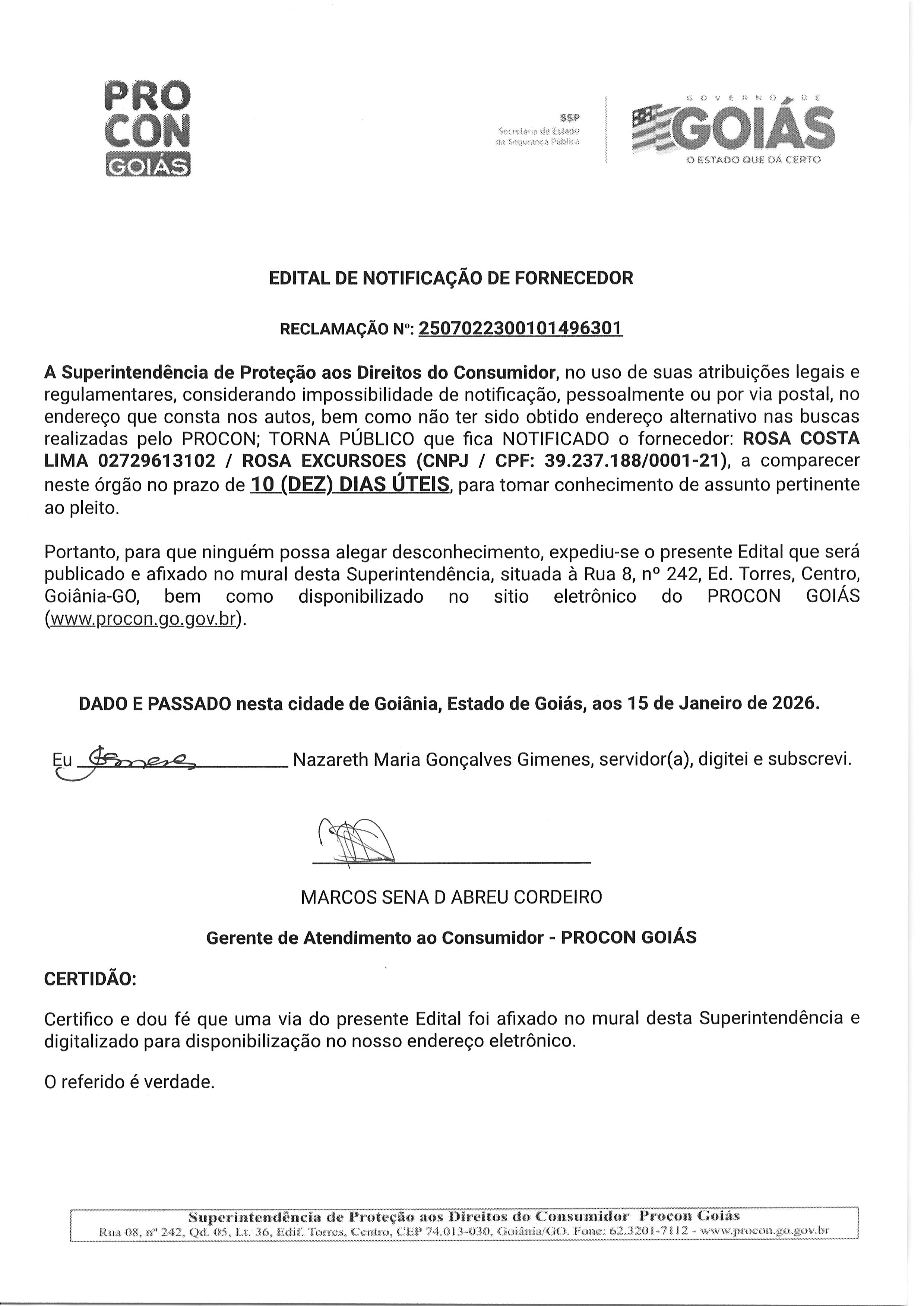 EDITAL DE NOTIFICAÇÃO Nº 2507022300101496301, FORNECEDOR ROSA COSTA LIMA Última Atualização em 27 de janeiro de 2026 Categoria Editais de Notificação, Fornecedor