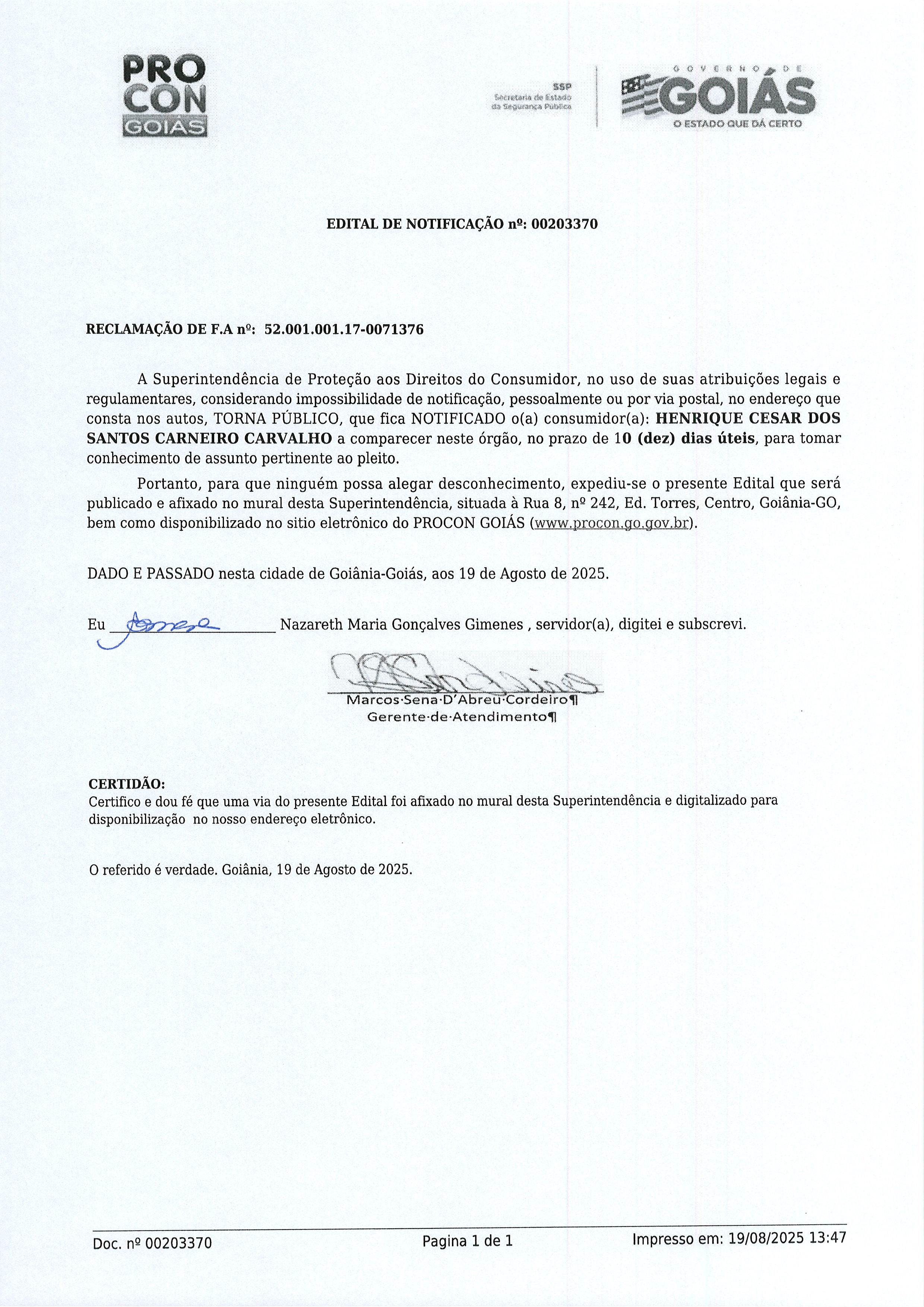 Edital de Notificação Nº , Consumidor HENRIQUE CESAR DOS SANTOS CARNEIRO CARVALHO Última Atualização em 1 de setembro de 2025 Categoria Consumidor, Editais de Notificação