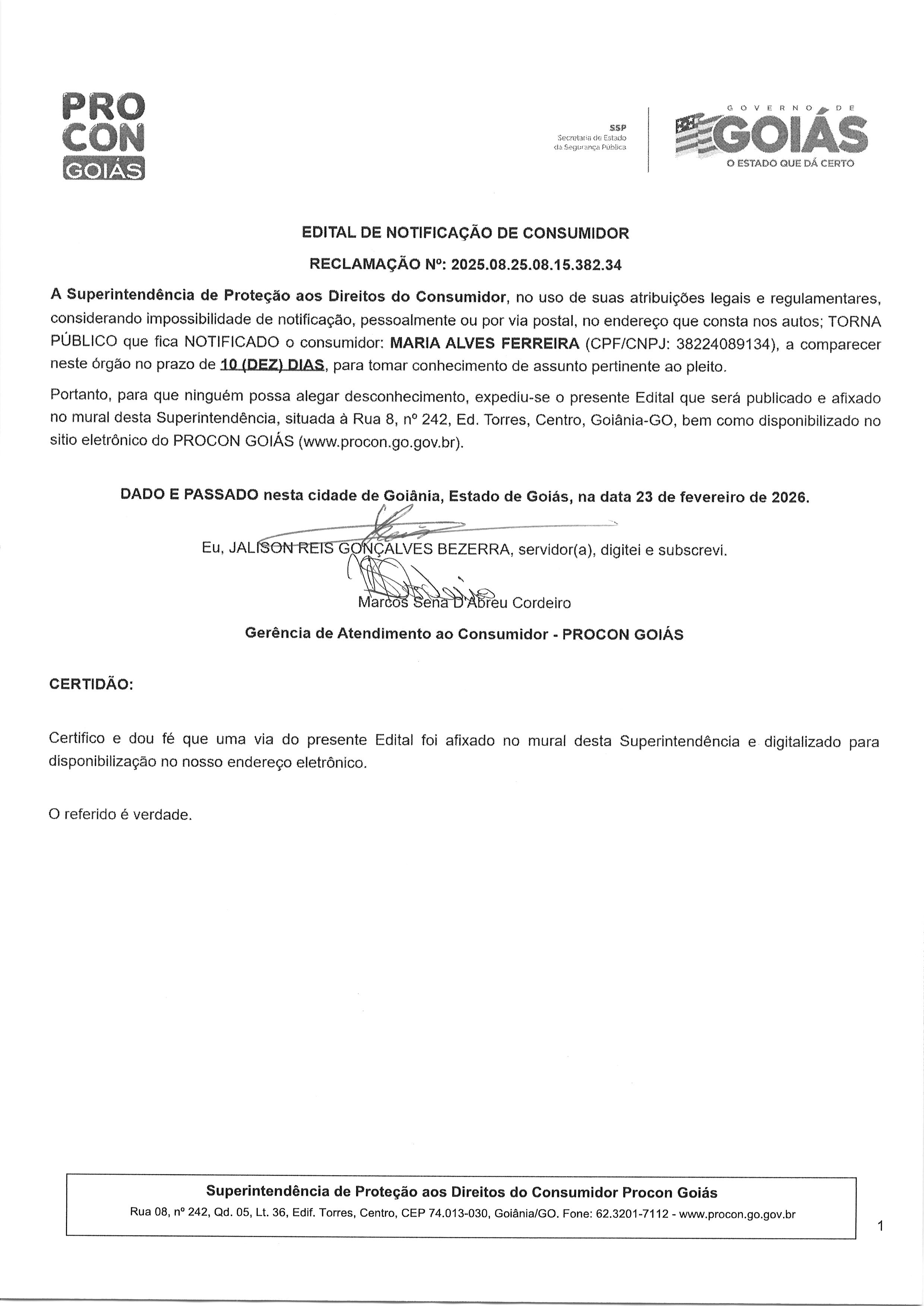 Edital do Consumidor de nº – 2025.08.25.08.15.382.34 – MARIA ALVES FERREIRA Última Atualização em 3 de março de 2026 Categoria Consumidor, Editais de Notificação 23