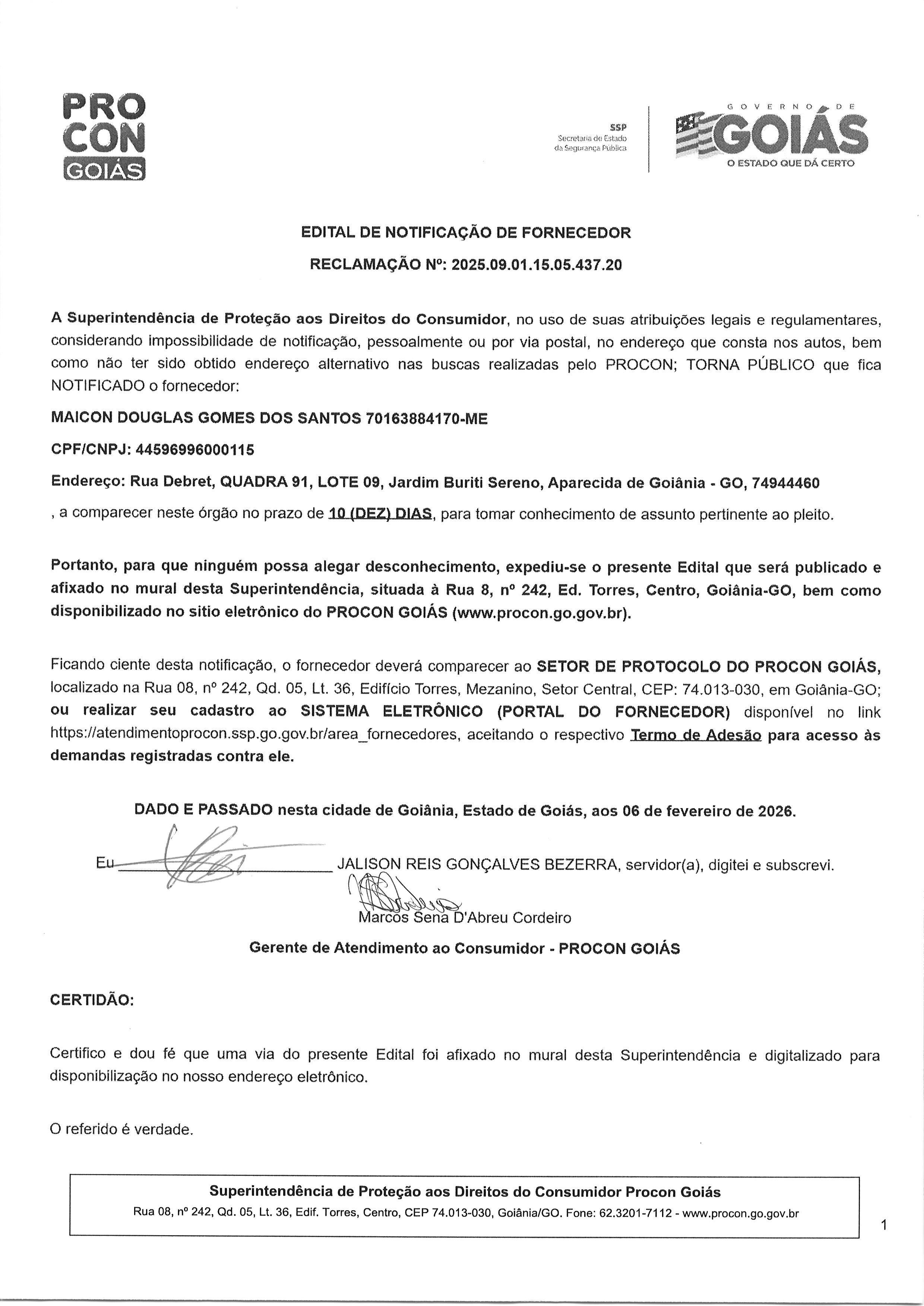 TERMO DE NOTIFICAÇAO DE Nº 2025.09.01.15.05.437.20 FORNECEDOR, MAICON DOUGLAS DOS SANTOS 70163884170-ME Última Atualização em 5 de março de 2026 Categoria Editais de Notificação, Fornecedor