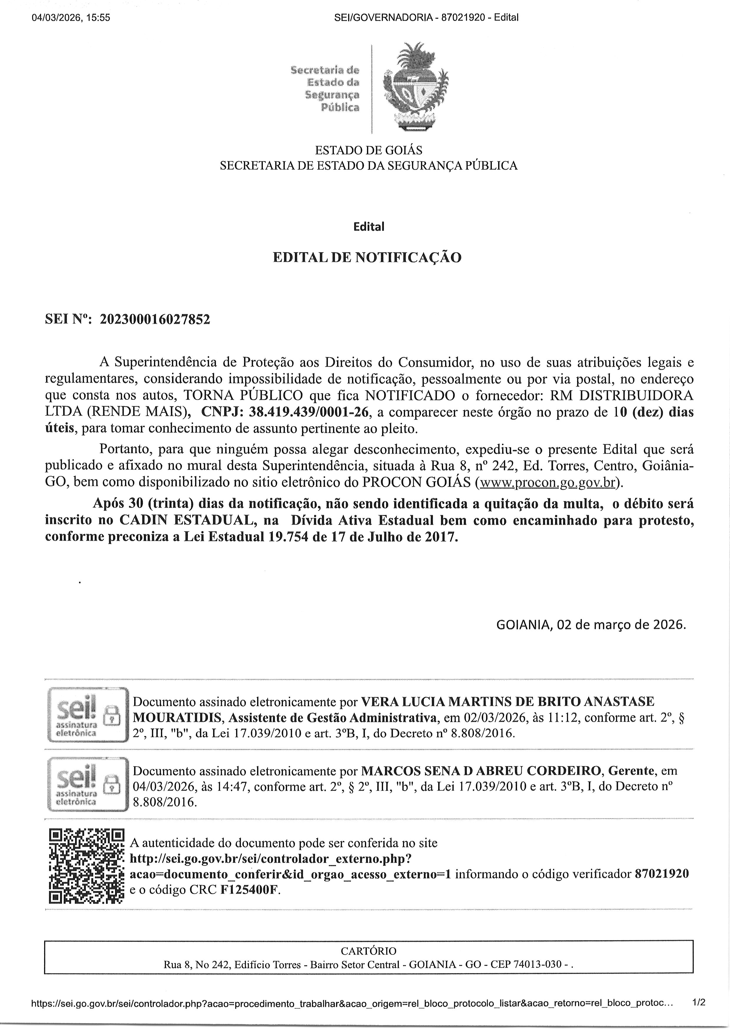 Termo de Notificação Nº 202300016027852, Fornecedor RM DISTRIBUIDORA LTDA Frente Última Atualização em 9 de março de 2026 Categoria Editais de Notificação, Fornecedor